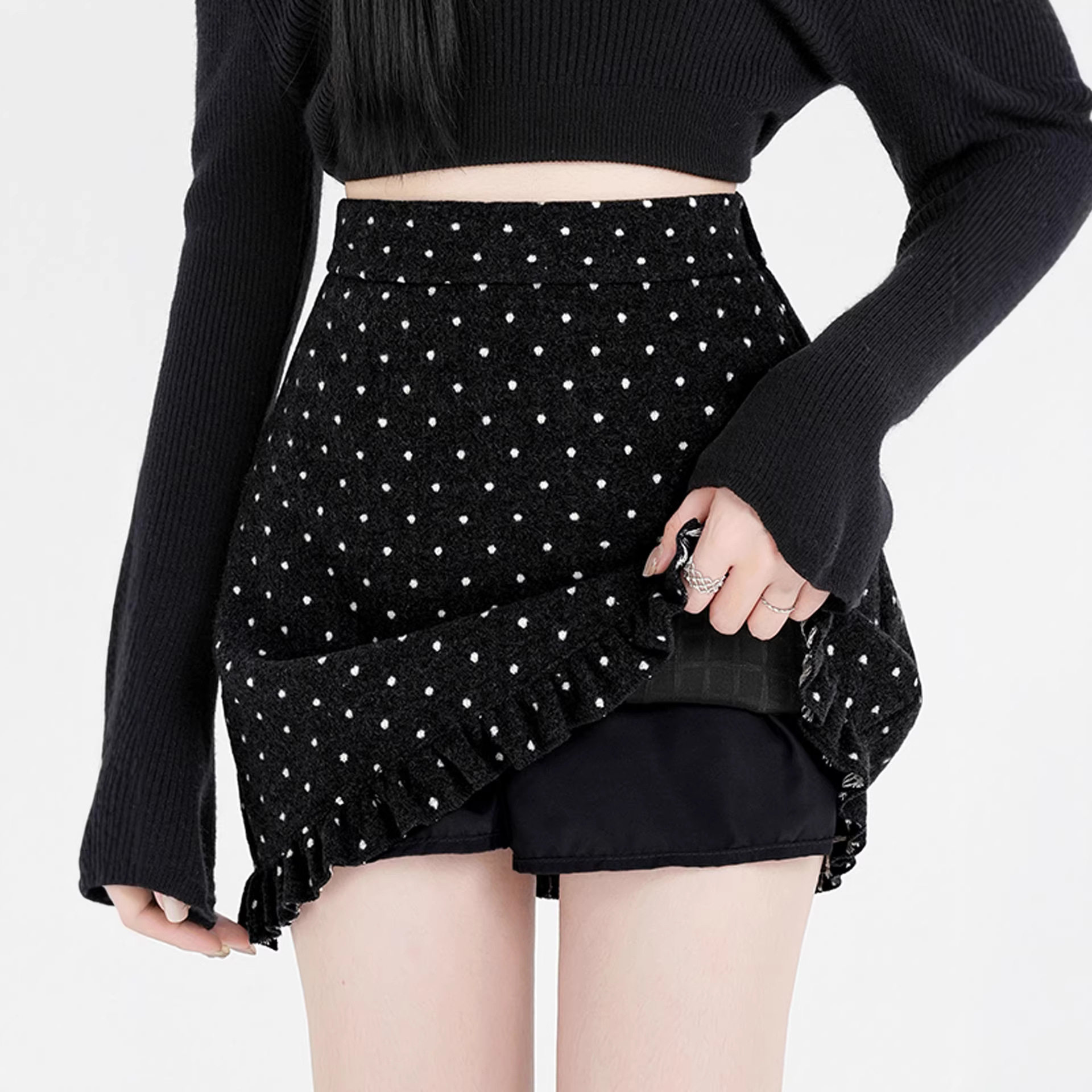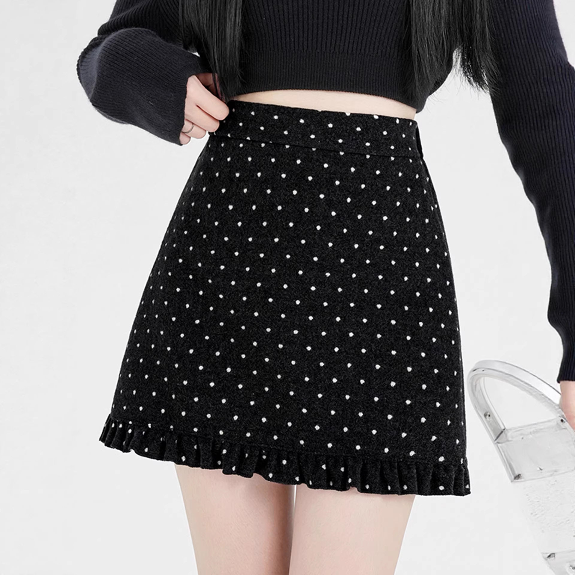 毛呢波点半身裙女秋冬小个子休闲高腰显瘦气质木耳边a字包臀短裙