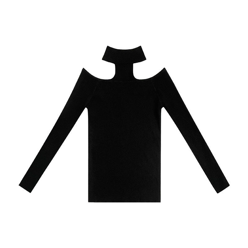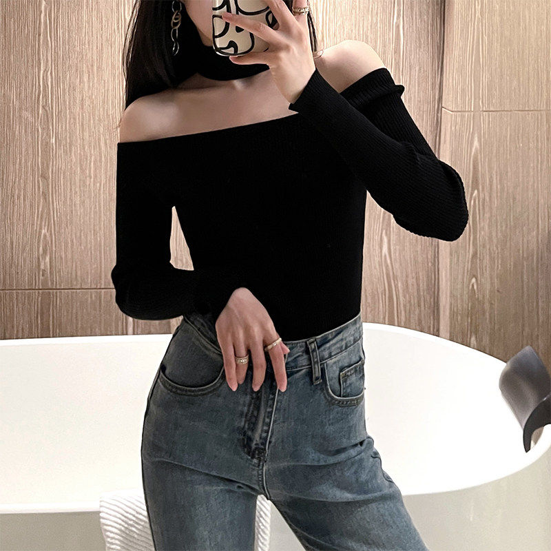 秋冬新款一字肩上衣挂脖毛衣女黑色露肩针织衫长袖辣妹性感打底衫