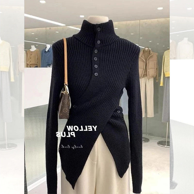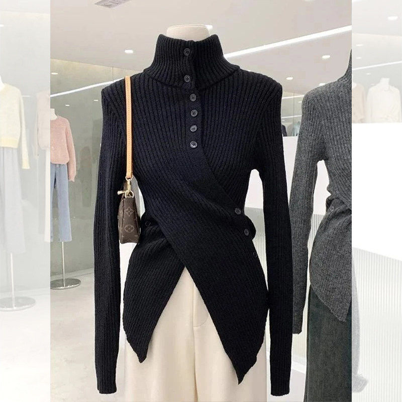 欧货灰色高领长袖针织打底衫女秋冬季不规则收腰毛衣内搭开叉上衣