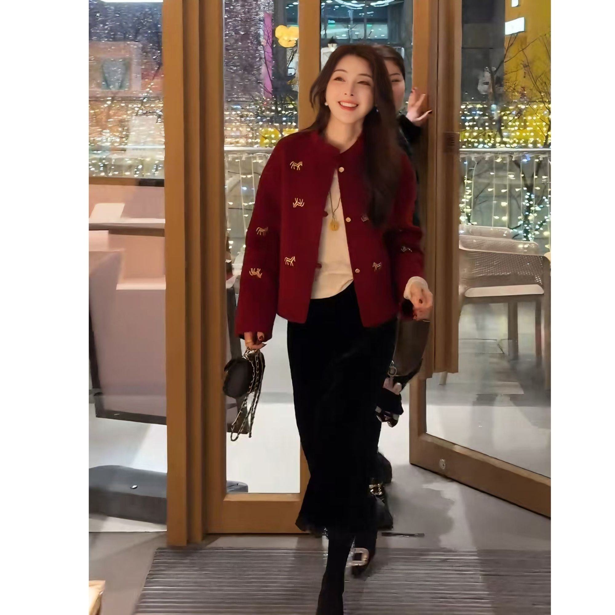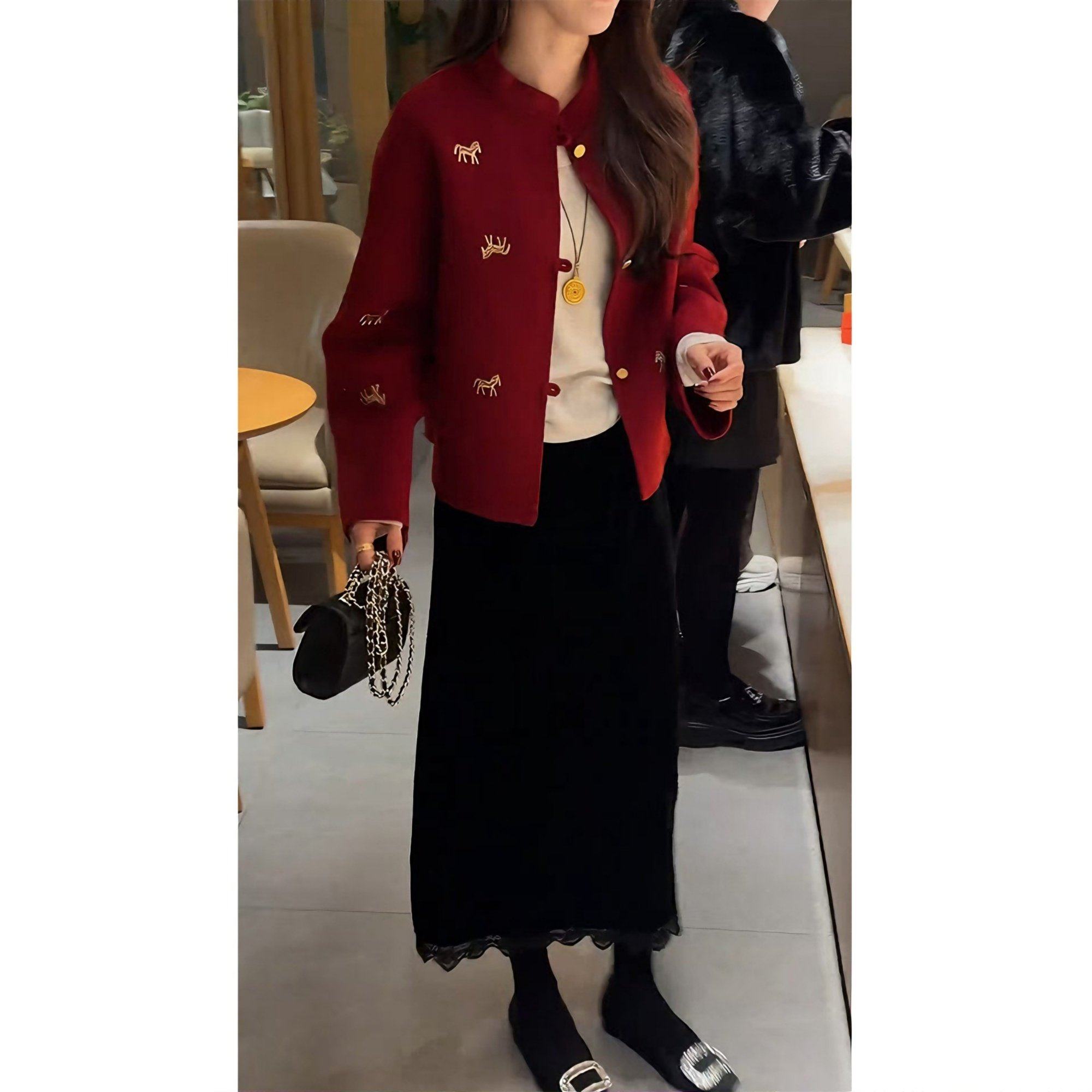 新中式贵气新年红色毛呢小马刺绣金扣立领开衫短款外套女冬季新款
