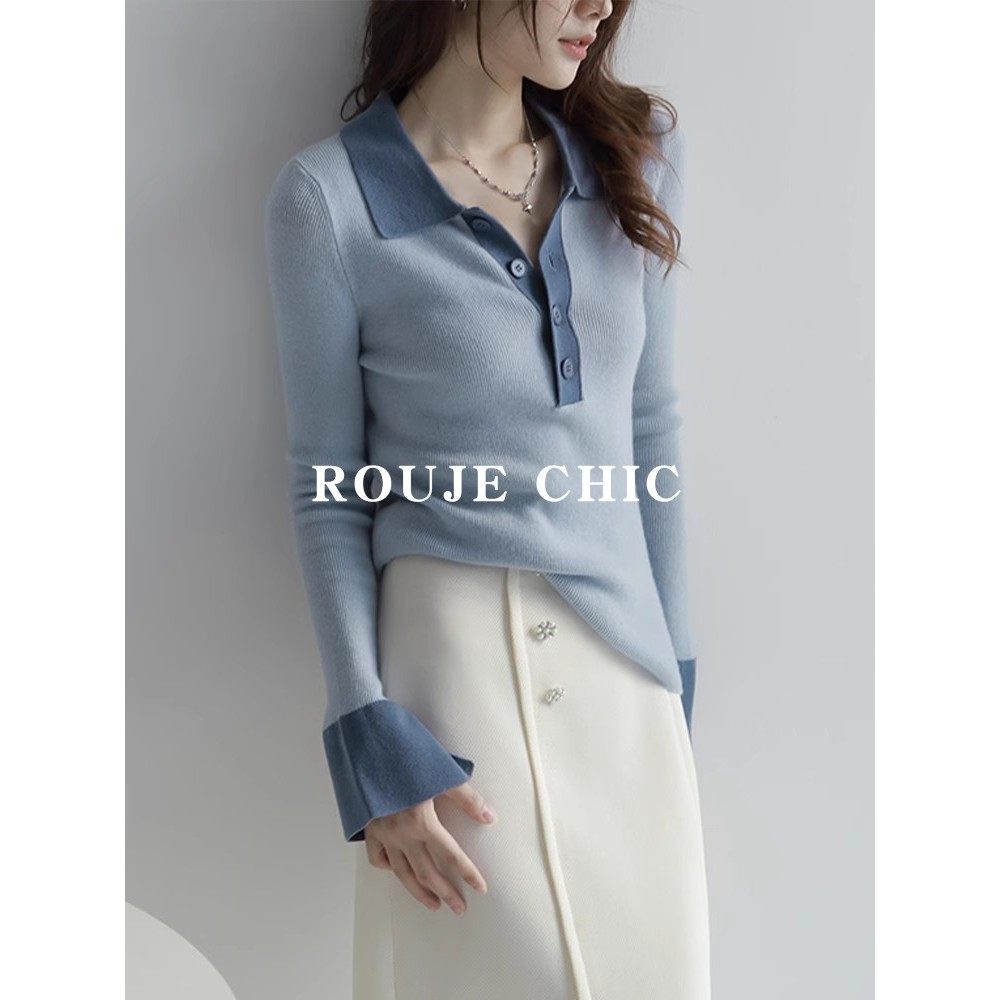 法国ROUJE CHIC法式长袖撞色polo领针织衫女秋季减龄气质修身毛衣