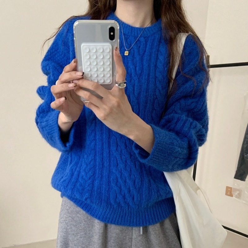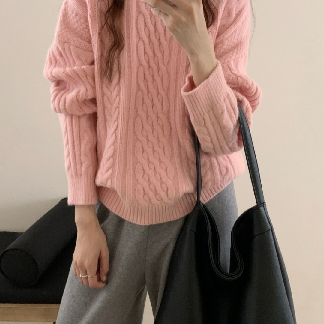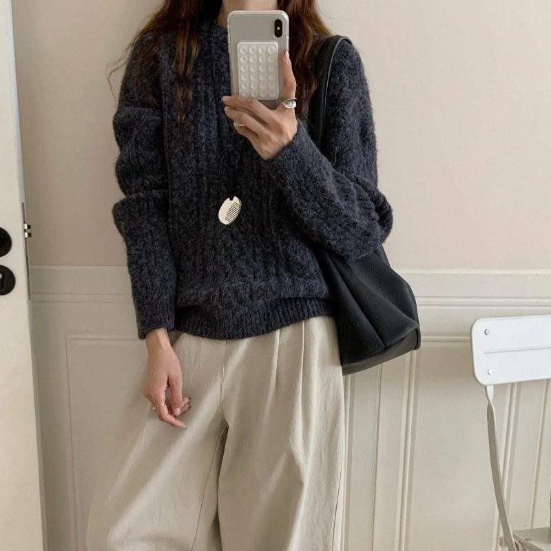 实拍 韩系软糯慵懒风简约圆领麻花毛衣女秋冬宽松外穿针织衫上衣