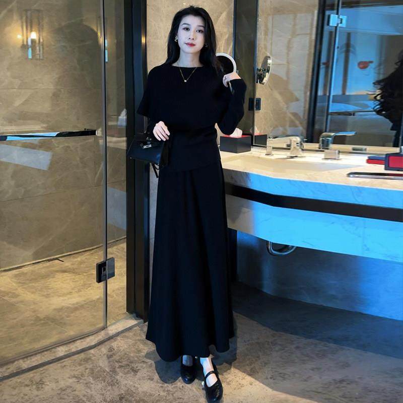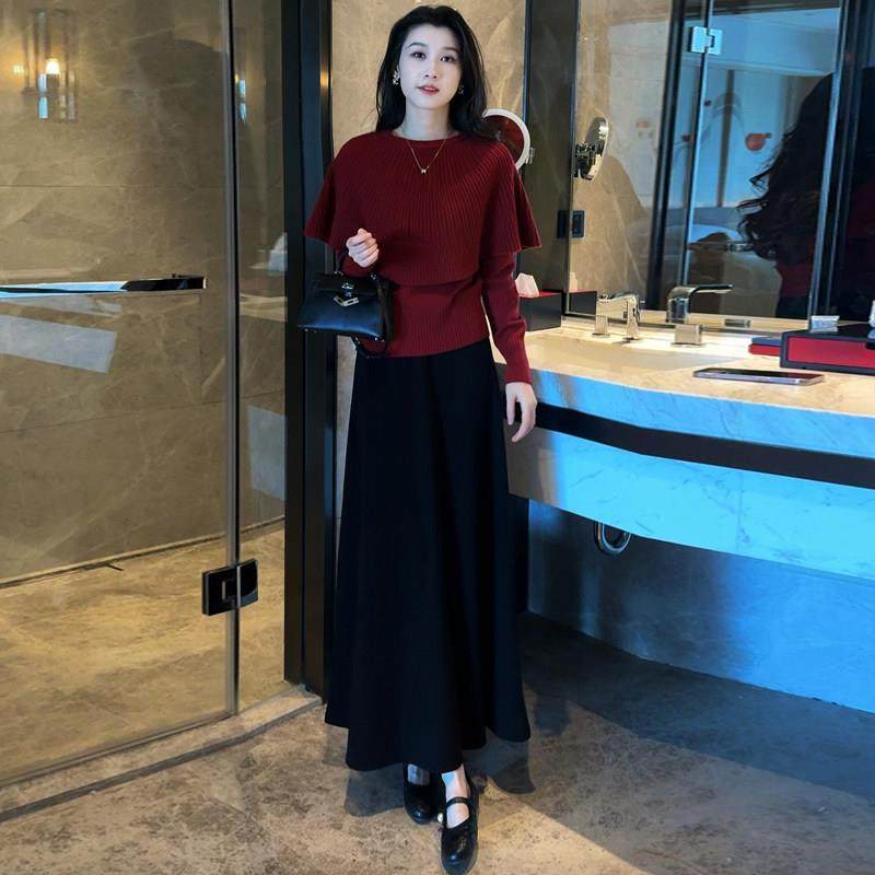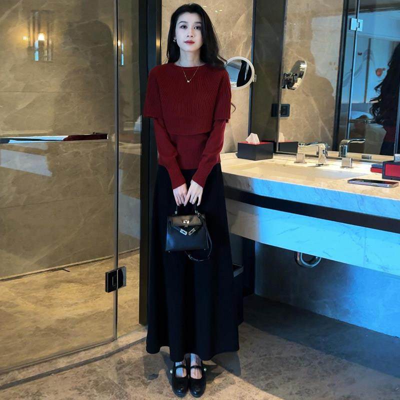 香港代购时尚套装裙女秋冬新款斗篷披肩假两件毛衣半身裙两件套潮
