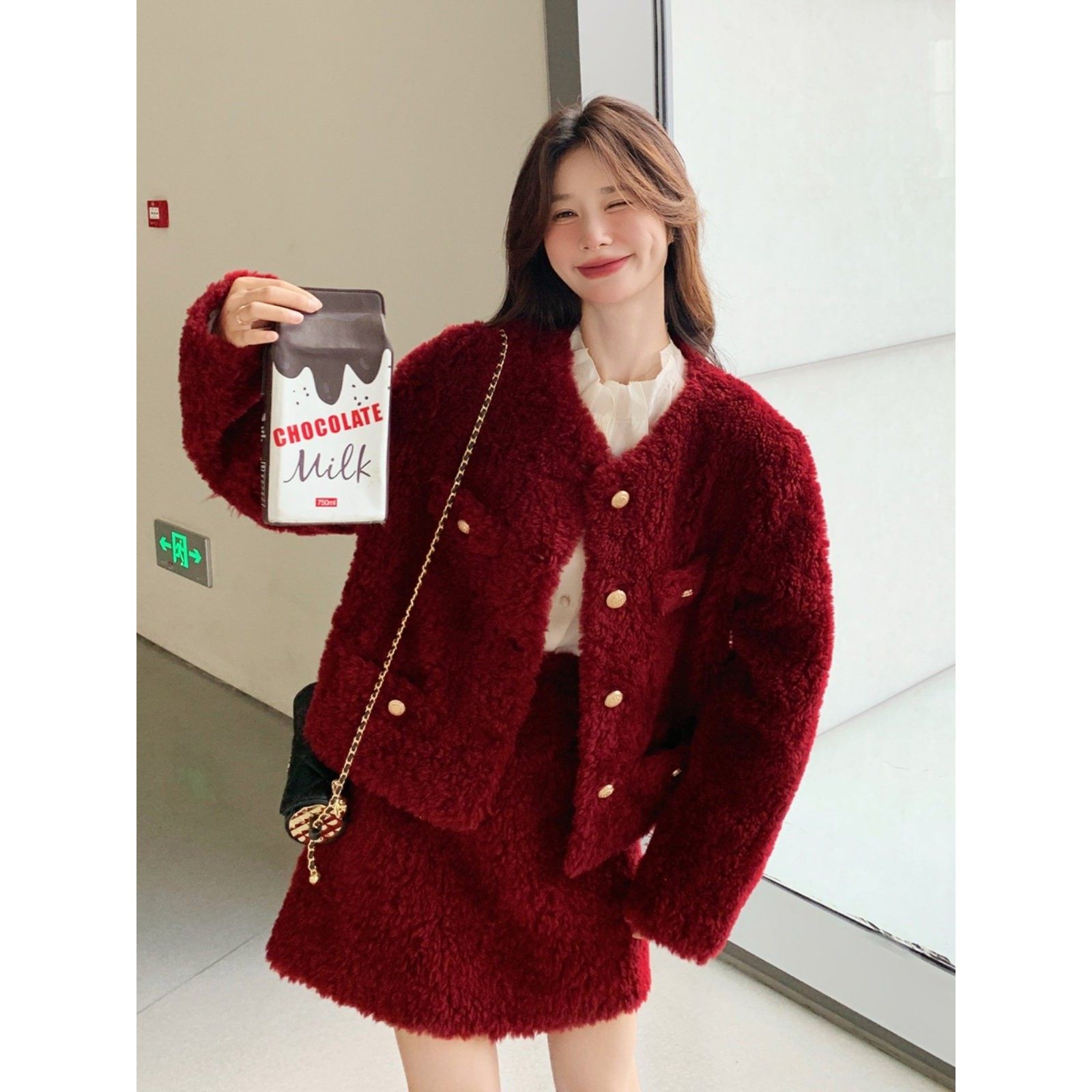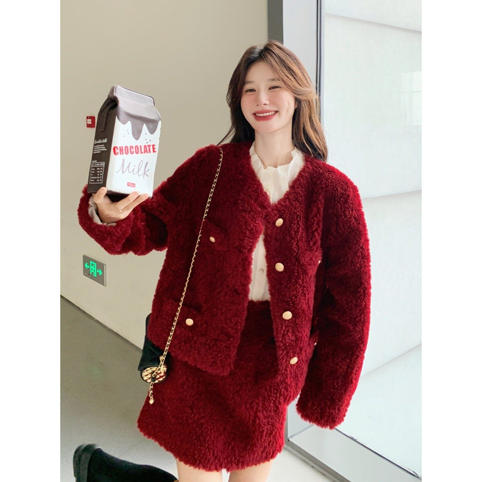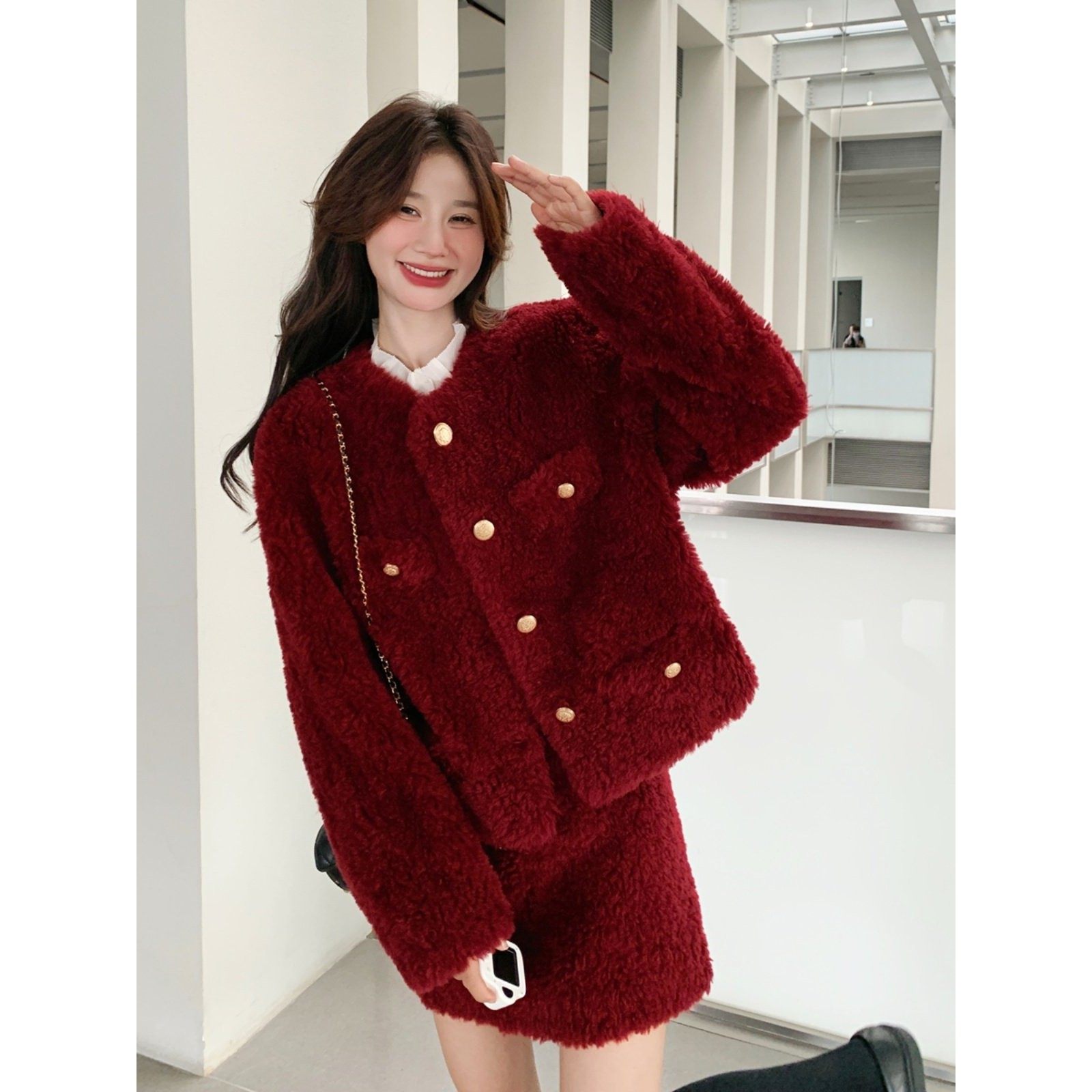 红色小香风套装女冬季2024新款羊羔毛外套短裙小个子加厚两件套