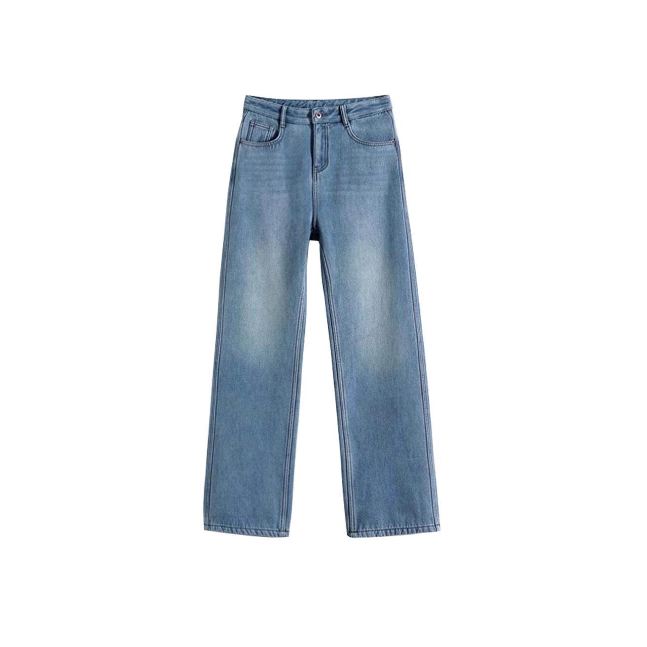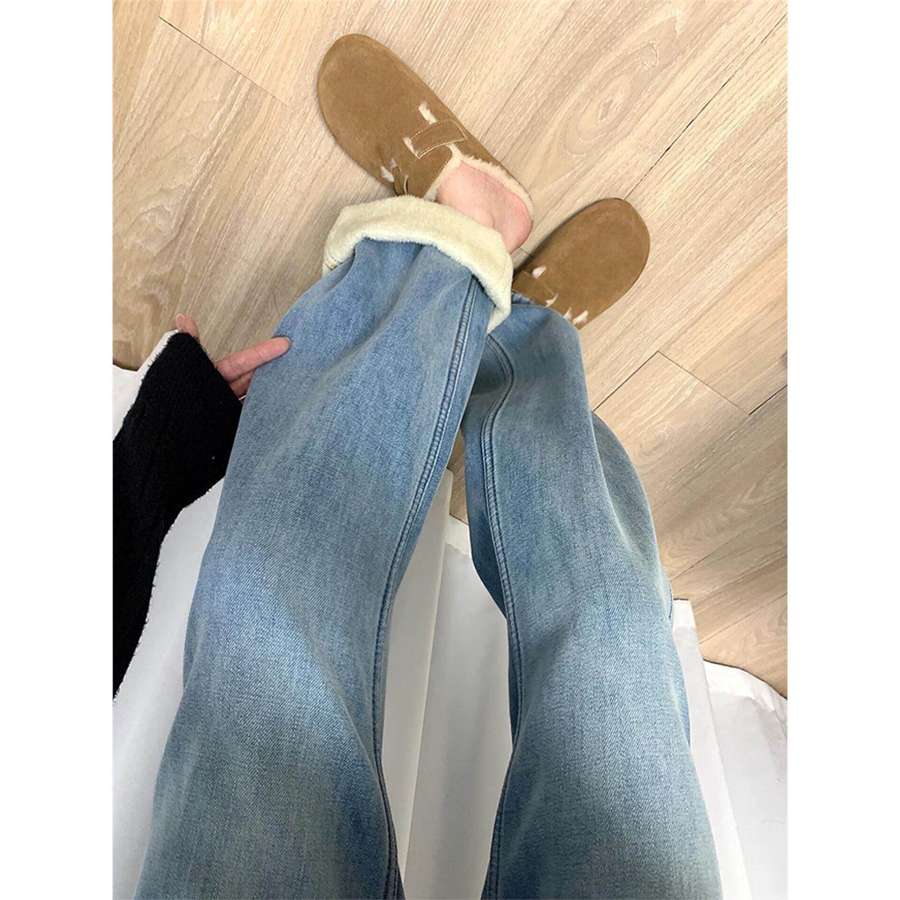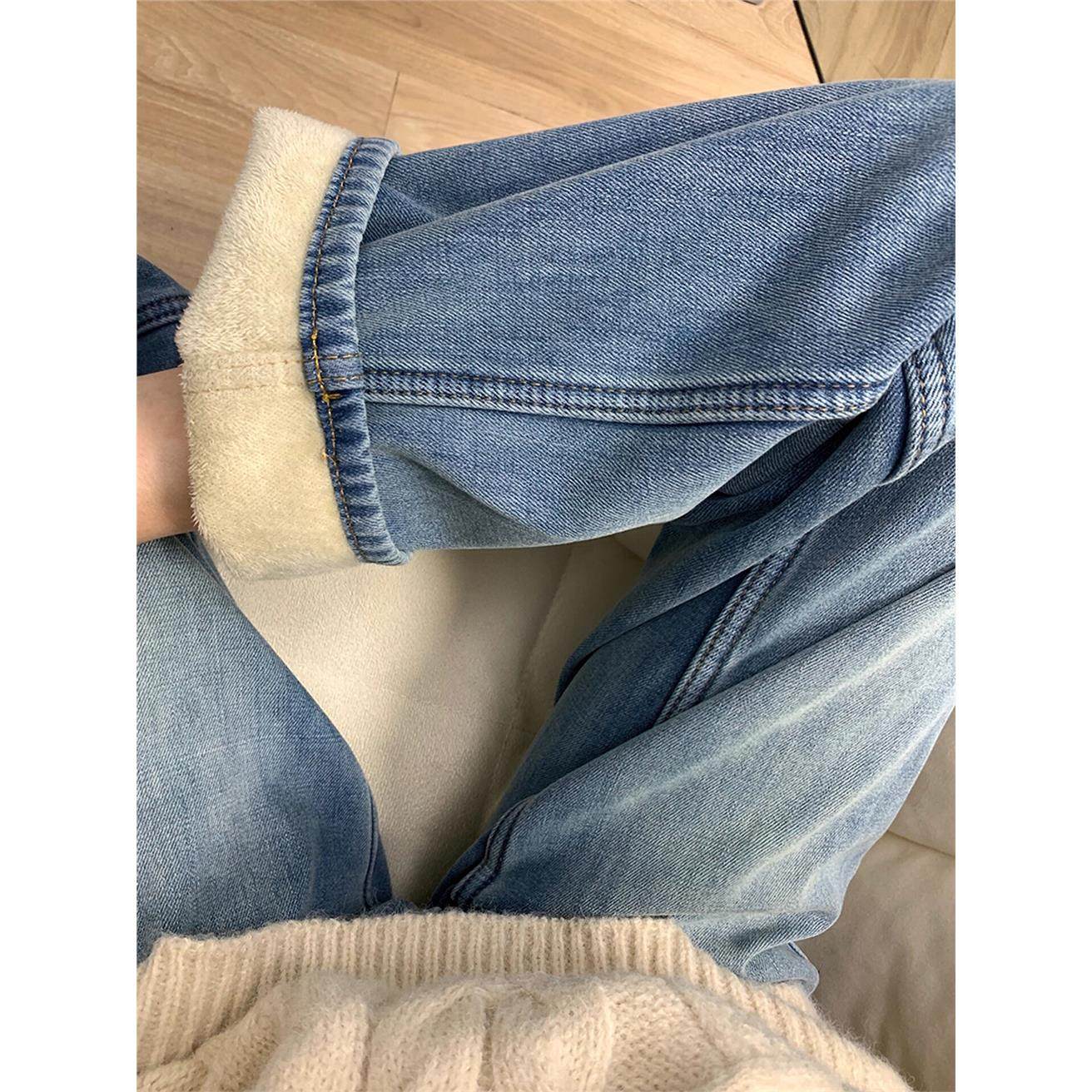 加绒加厚覆古蓝直筒牛仔裤女秋冬季胖妹妹mm高腰宽松显瘦阔腿长裤
