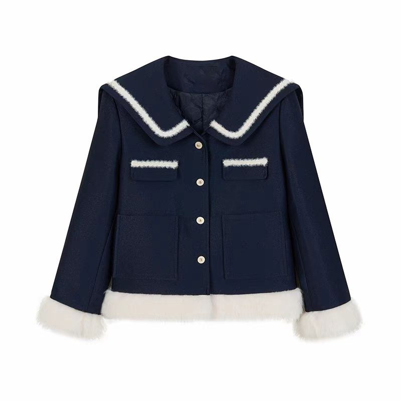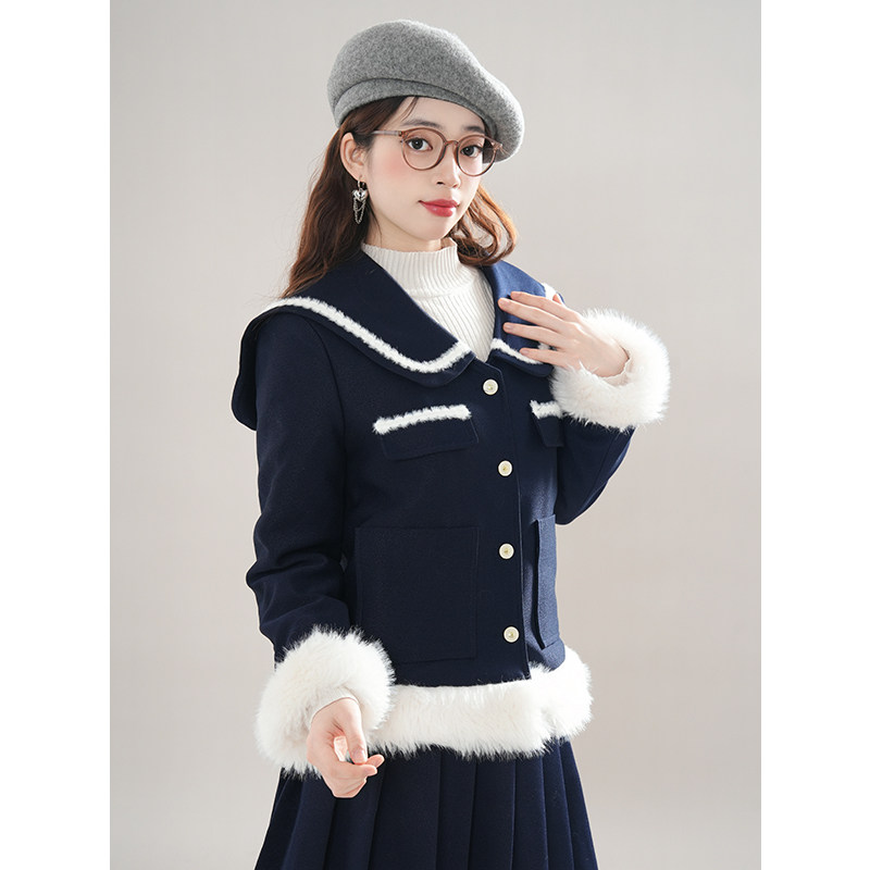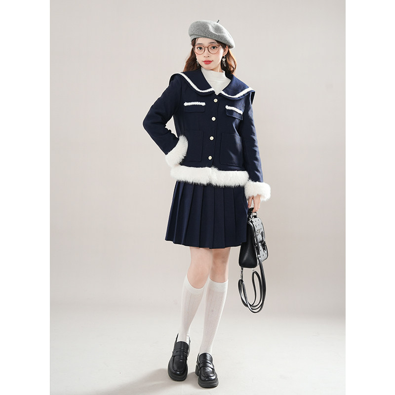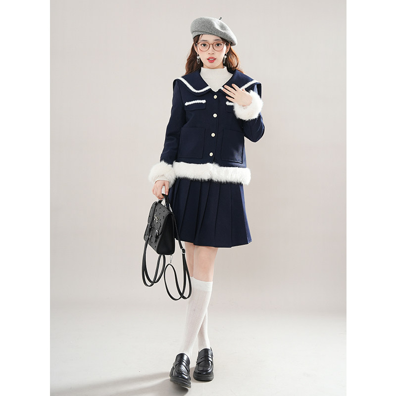 秋冬2024新品千金财阀加厚藏青小香风夹棉外套女韩版毛呢套装裙