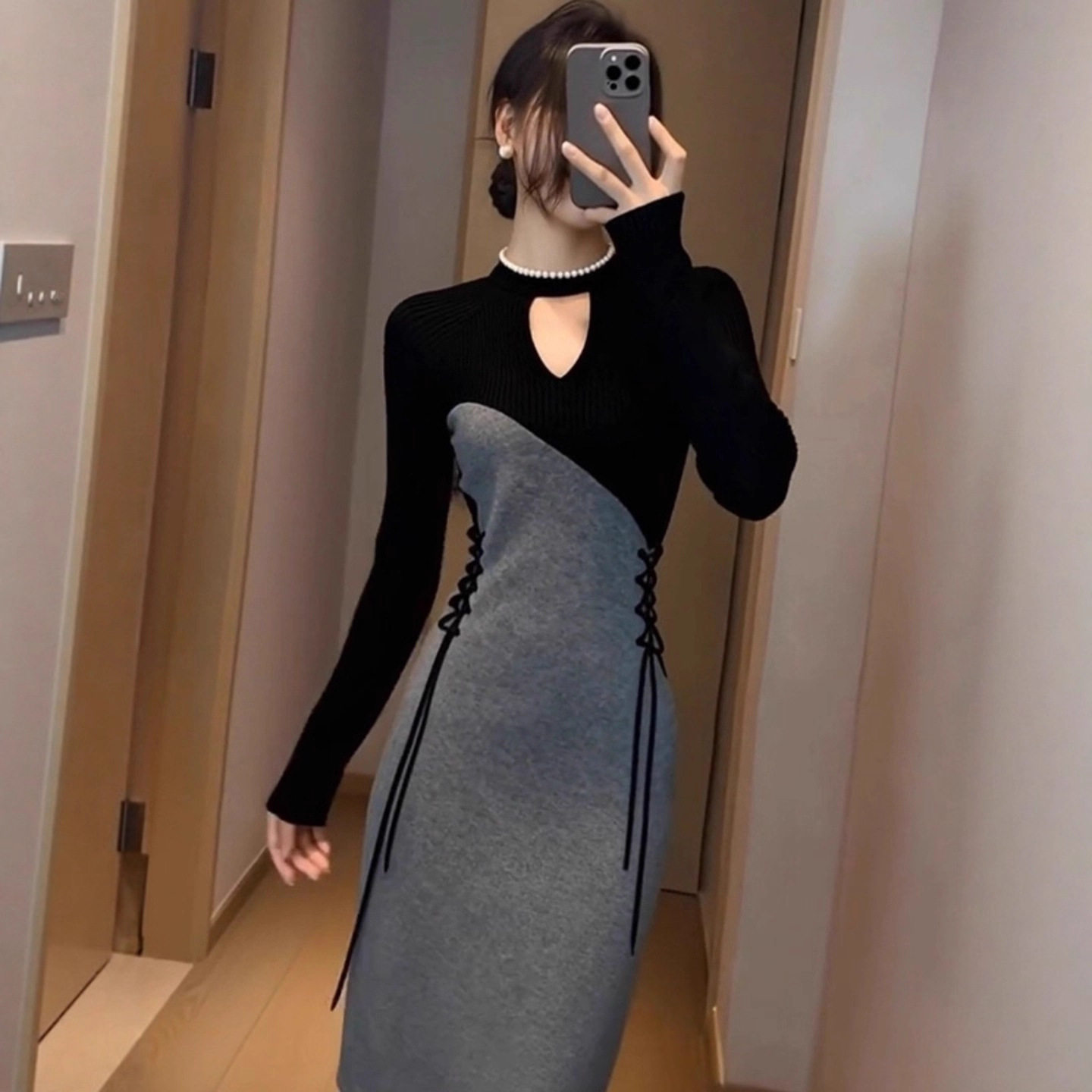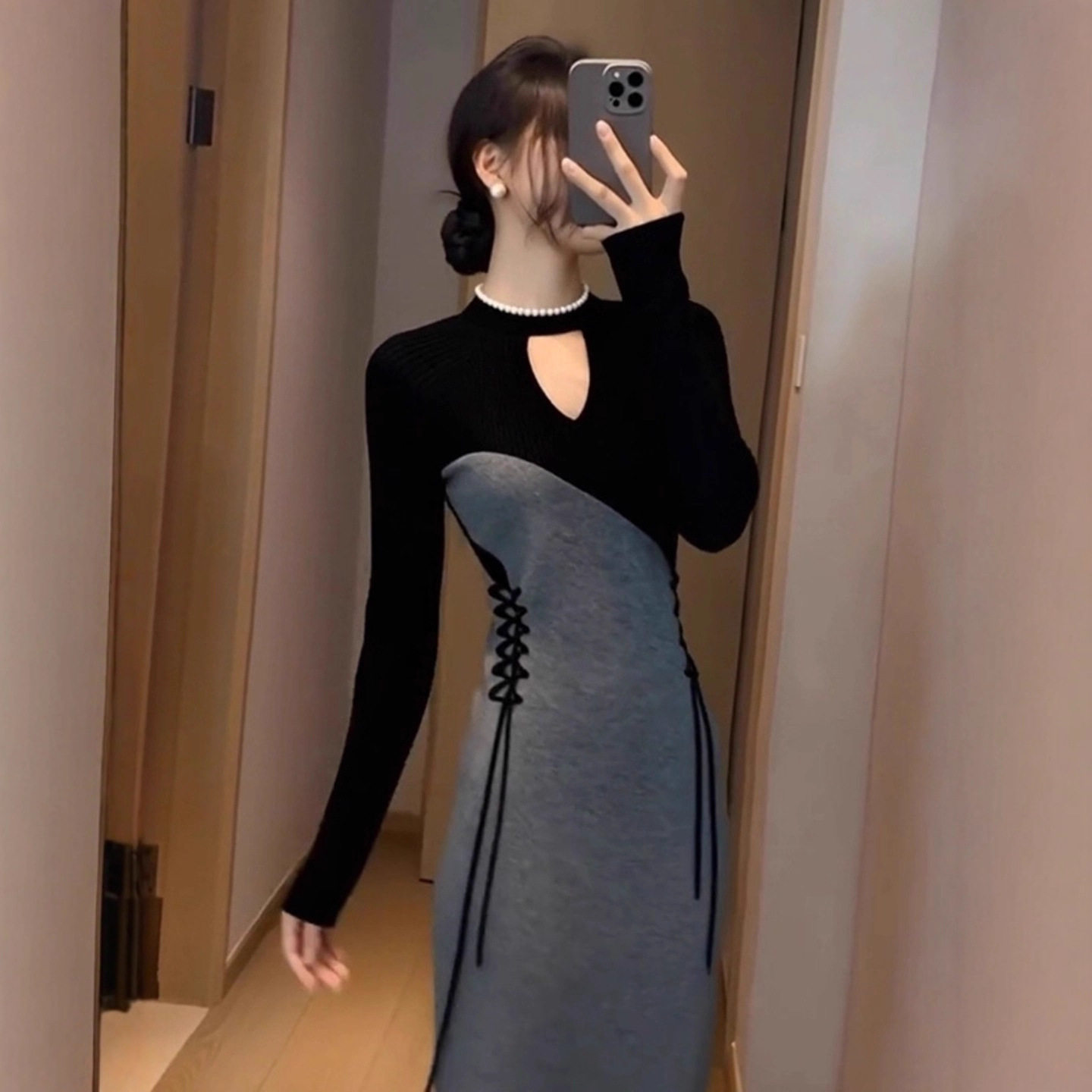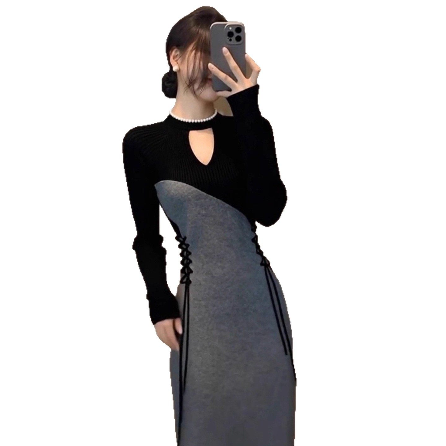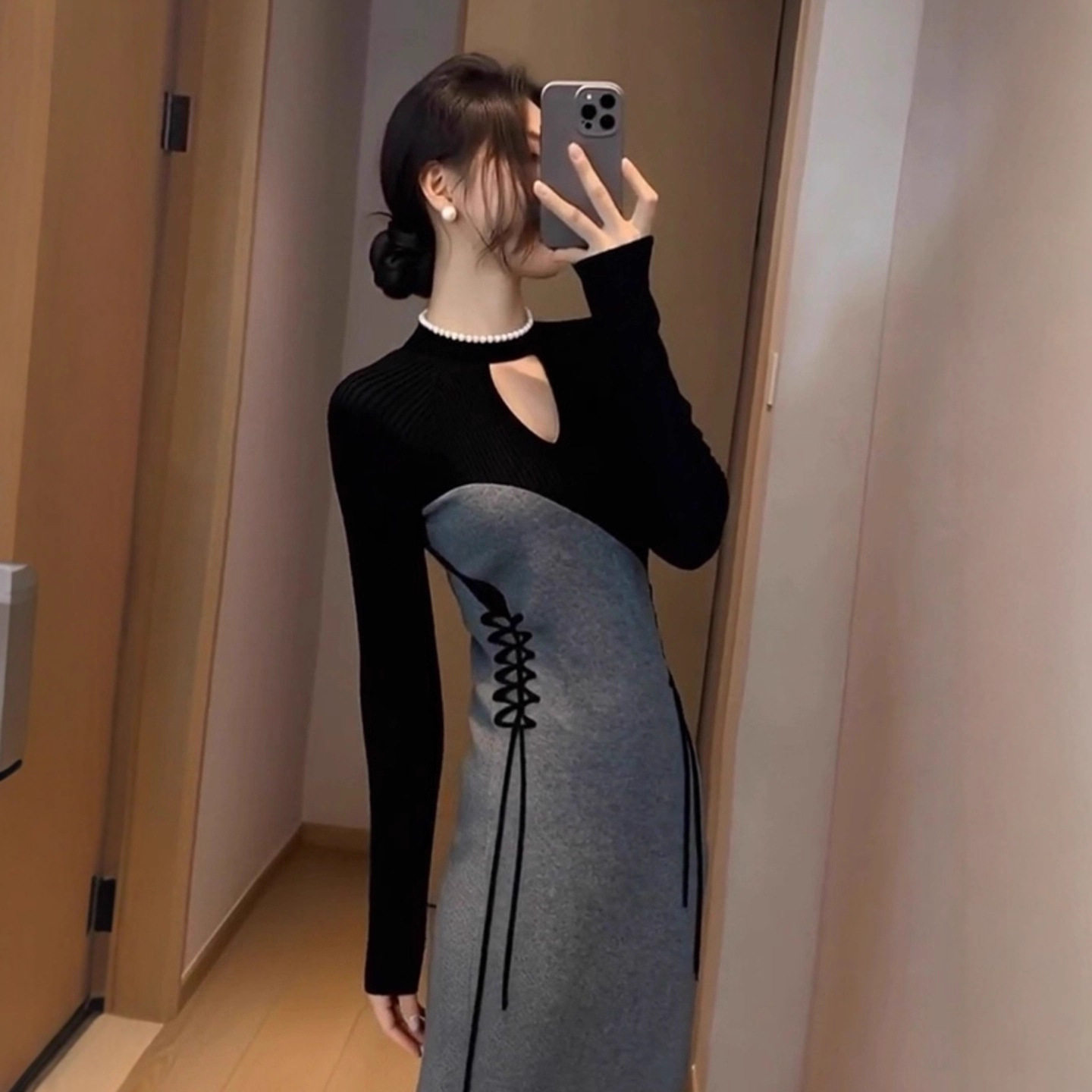法式独特漂亮拼接连衣裙冬季新款小众设计感气质名媛系带长裙