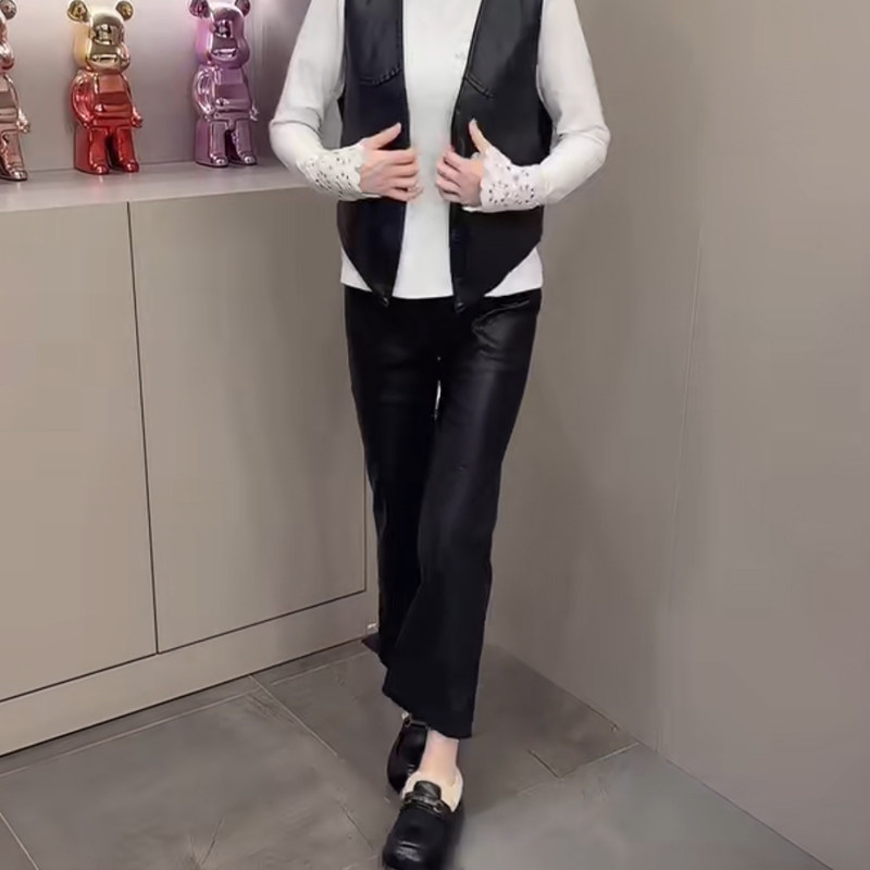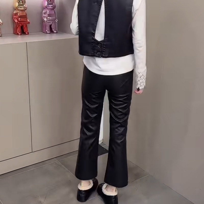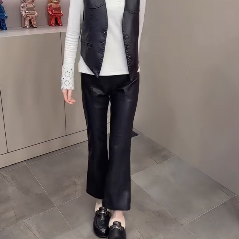 纯色弹力涂层PU皮裤2026春季休闲净版松紧高腰百搭显瘦九分微喇裤