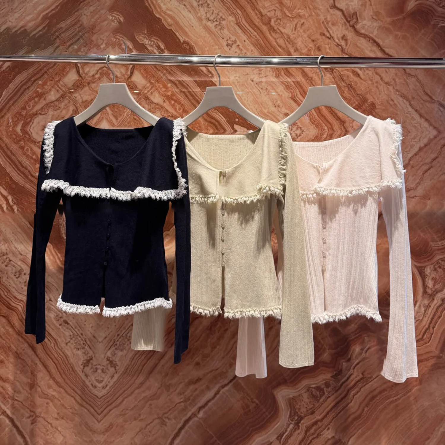 深圳南油高端女装2026春季新款法式温柔风荷叶边蕾丝拼接针织衫女