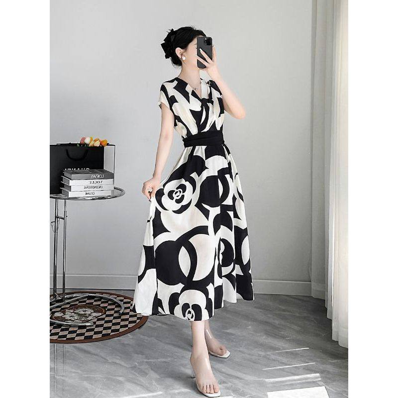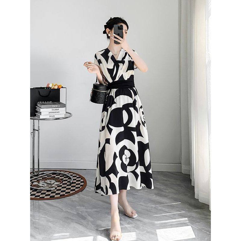 高档连衣裙新款韩版短袖V领修身显瘦夏天裙子女中长款印花a字裙子