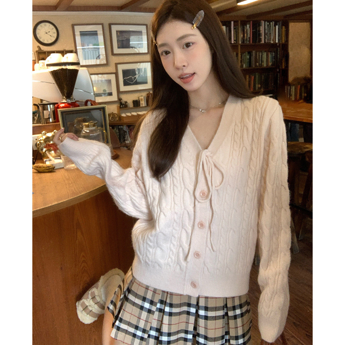 morning bloom粉色软糯麻花系绳V领毛衣女冬长袖针织开衫外套上衣
