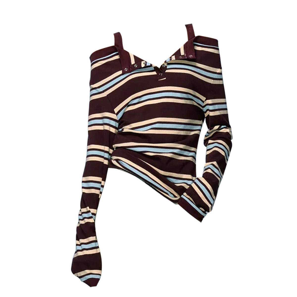 新品香港早秋辣妹韩系撞色条纹吊带长袖T恤女慵懒显瘦一字肩上衣