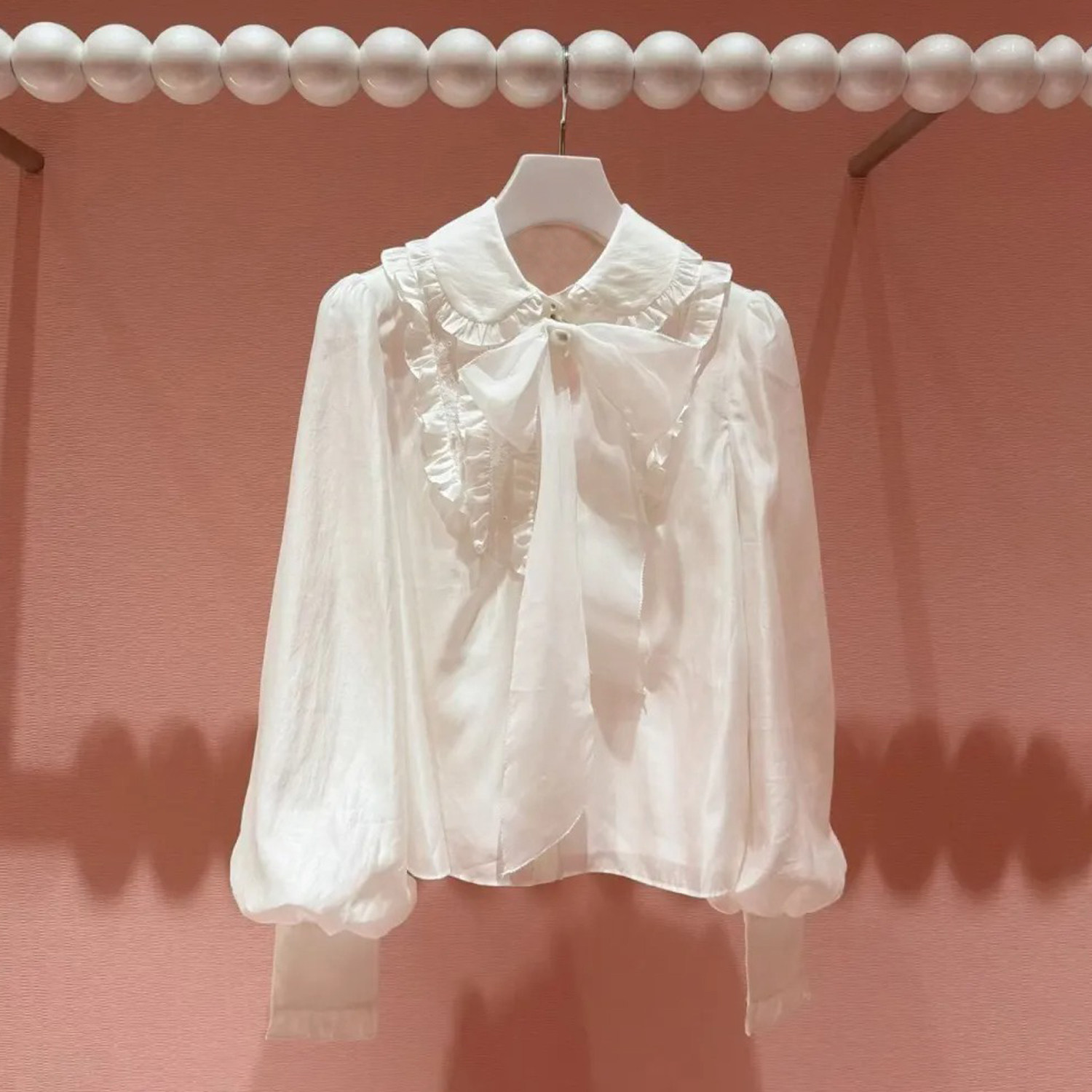 首页> 女装> 深圳南油高端女装2026春季新款淑女风白色蝴蝶结飘带高级感衬衫女