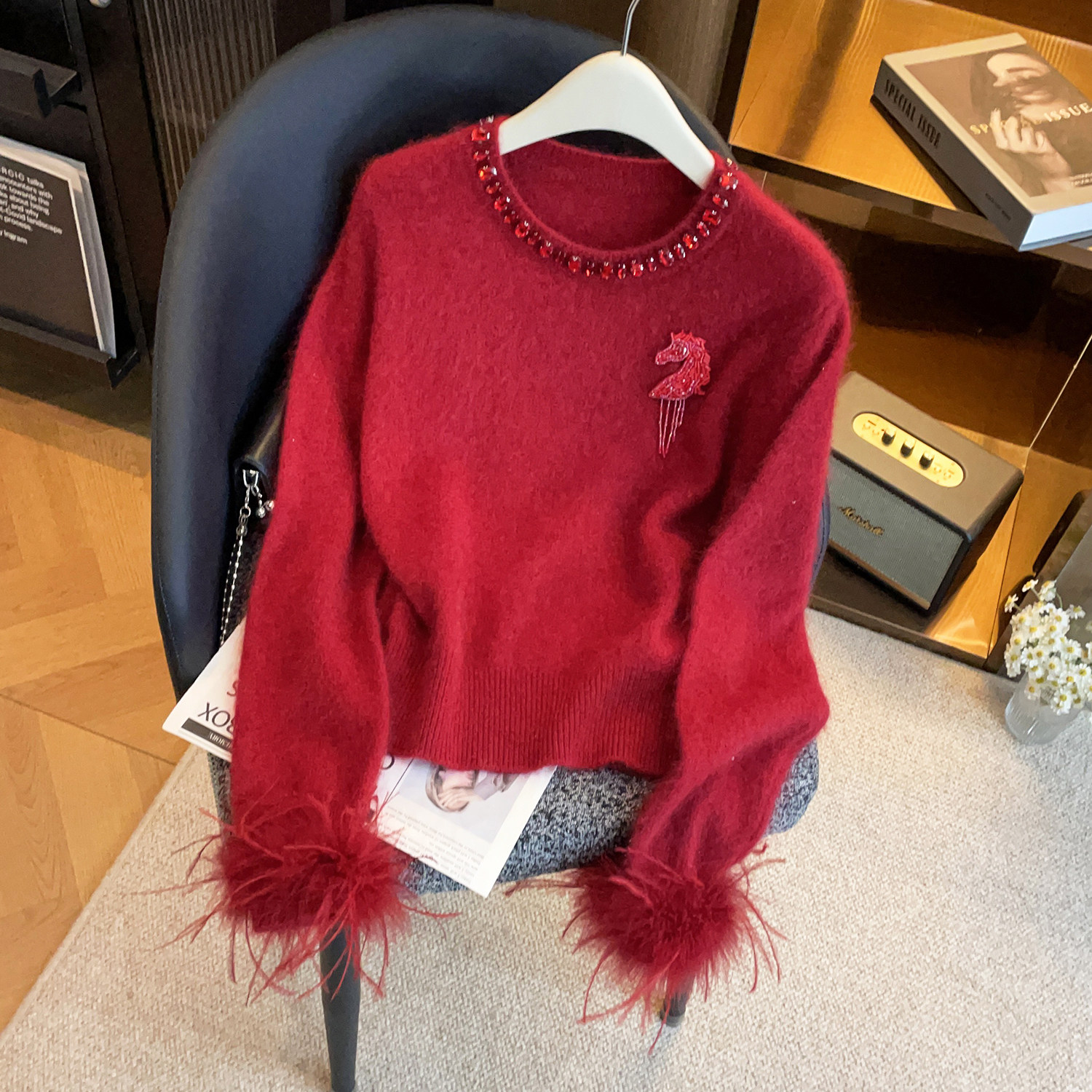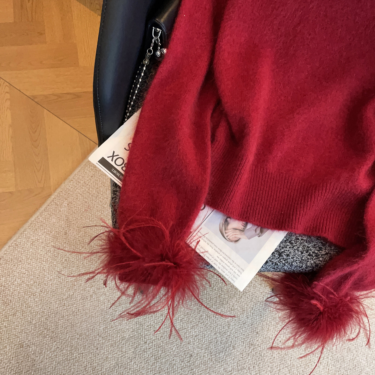 首页> 女装> 深圳南油高端女装2026春季新款小香风钉珠设计感羽毛袖口针织衫女