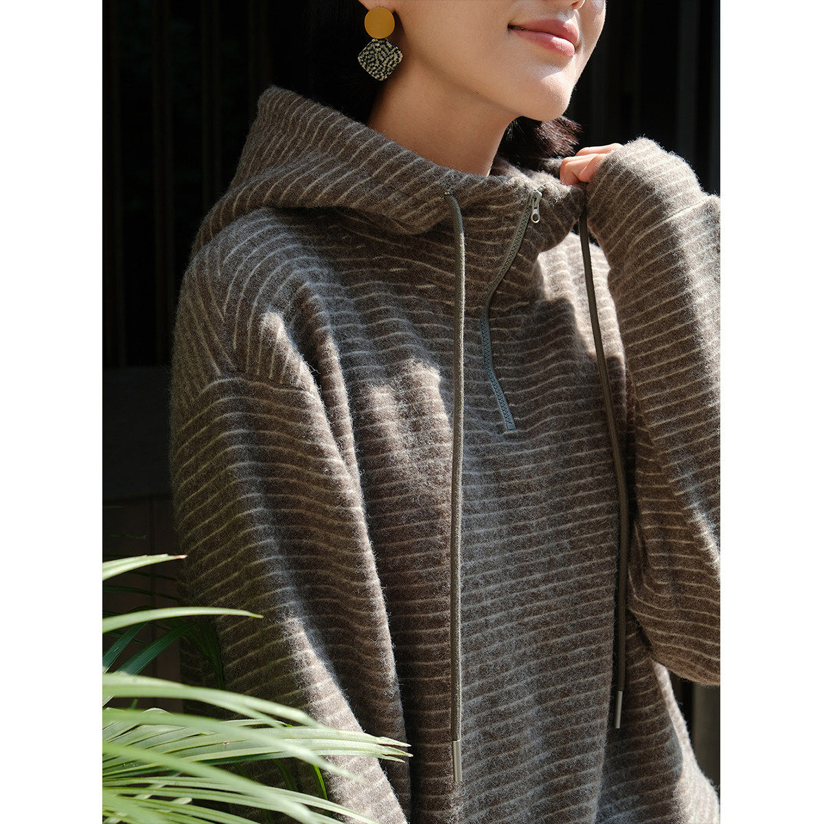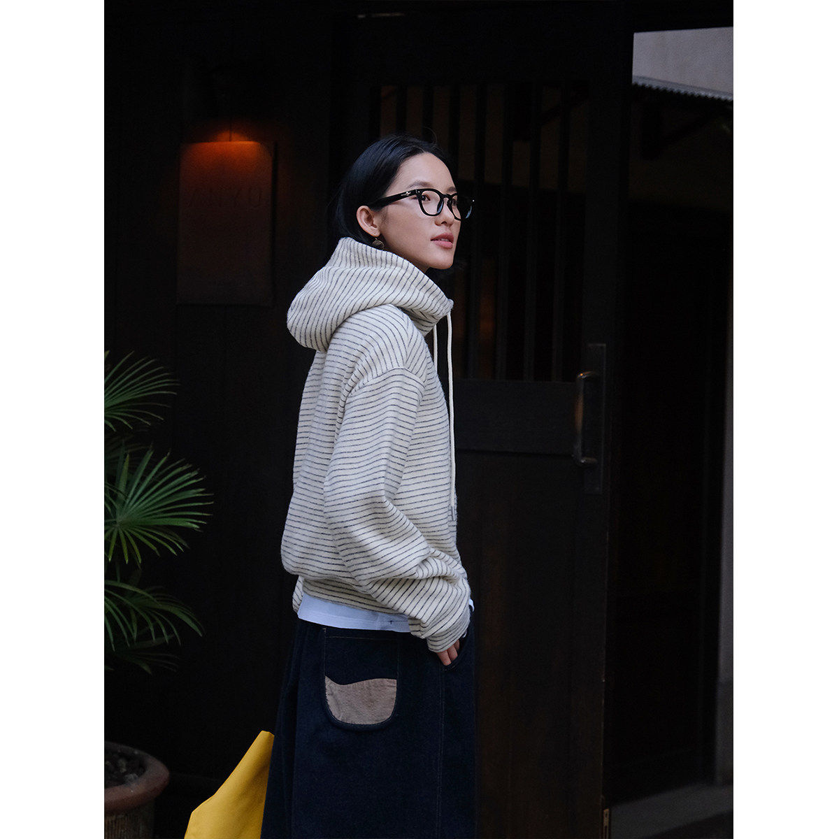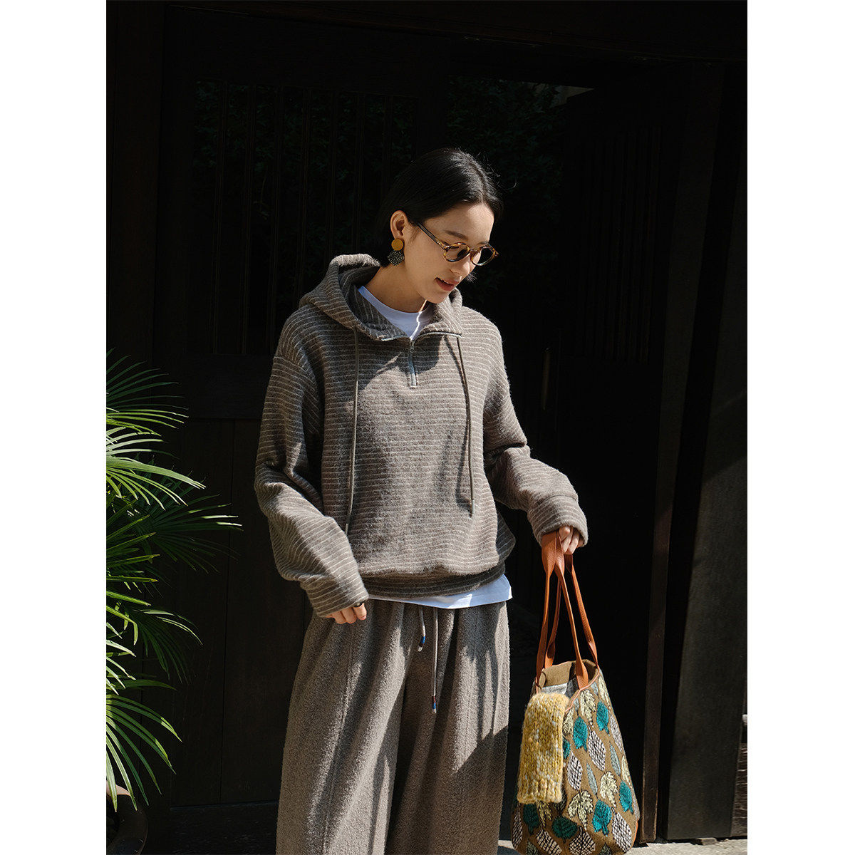 麻霖2025冬新品柔软亲肤可机洗细条纹半拉链套头上衣连帽卫衣
