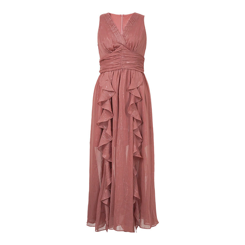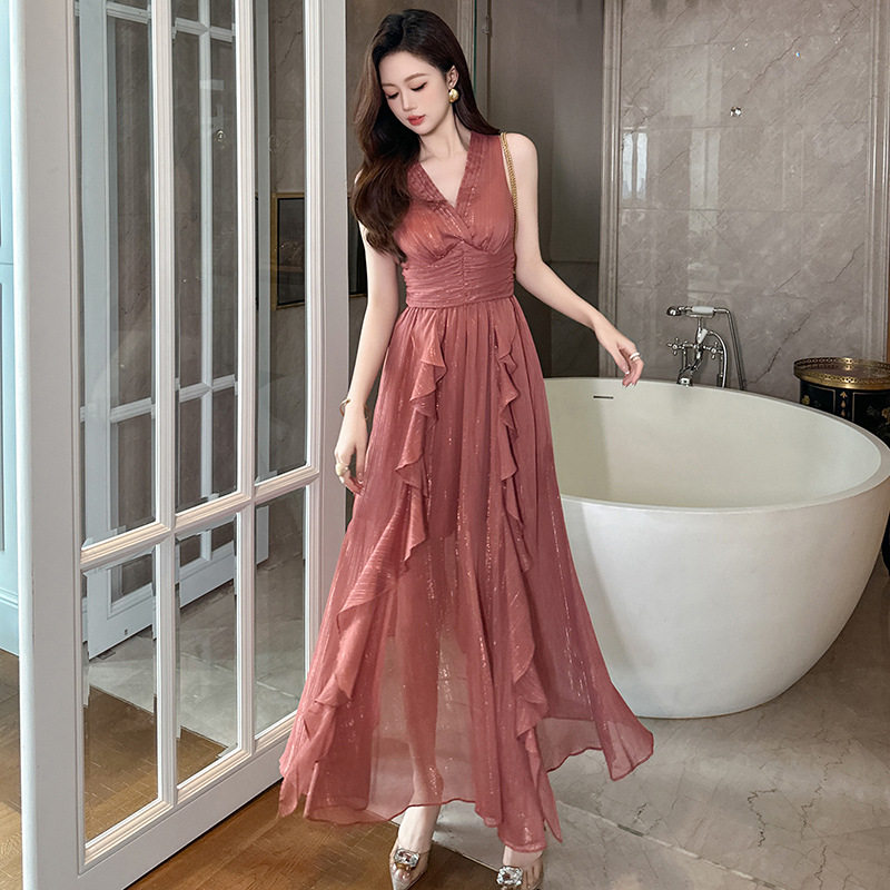 海边度假长裙2025夏季新款法式V字领收腰不规则雪纺连衣裙女50911
