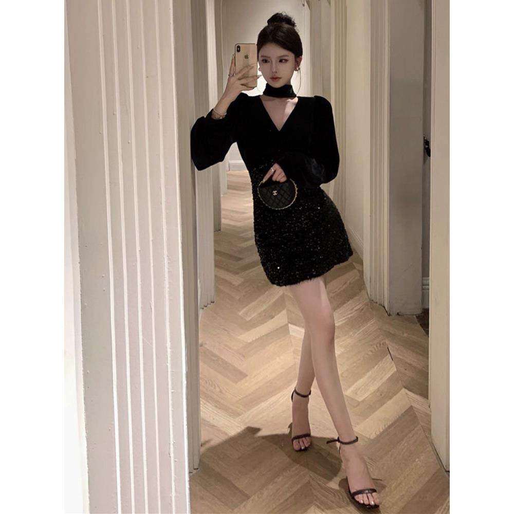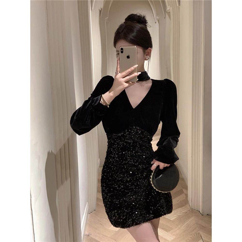 首页> 女装> 法国黑色亮片V领金丝绒女装春夏小香名人紧身短裙生日礼服