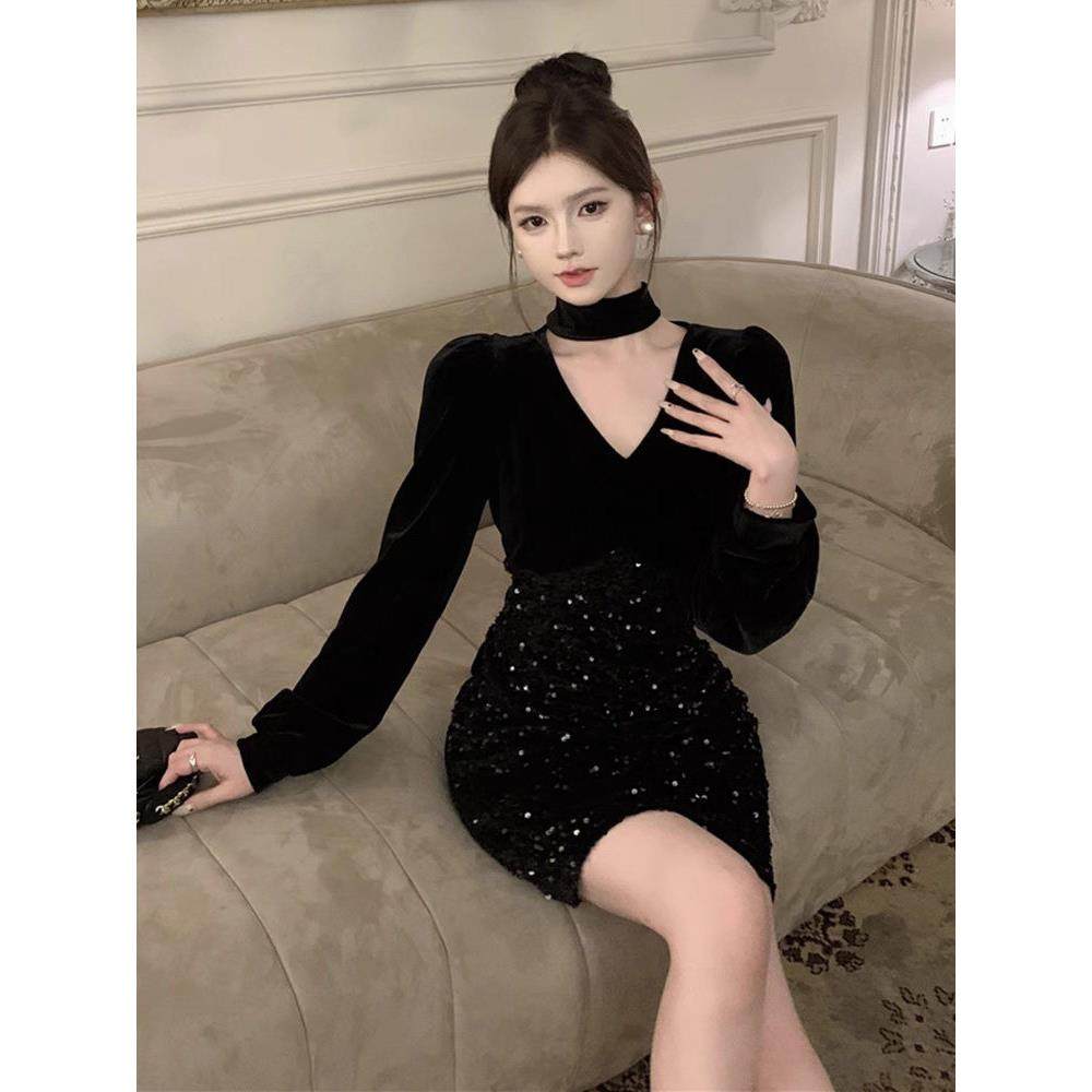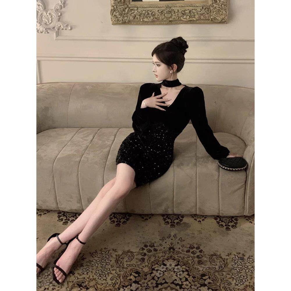 法国黑色亮片V领金丝绒女装春夏小香名人紧身短裙生日礼服