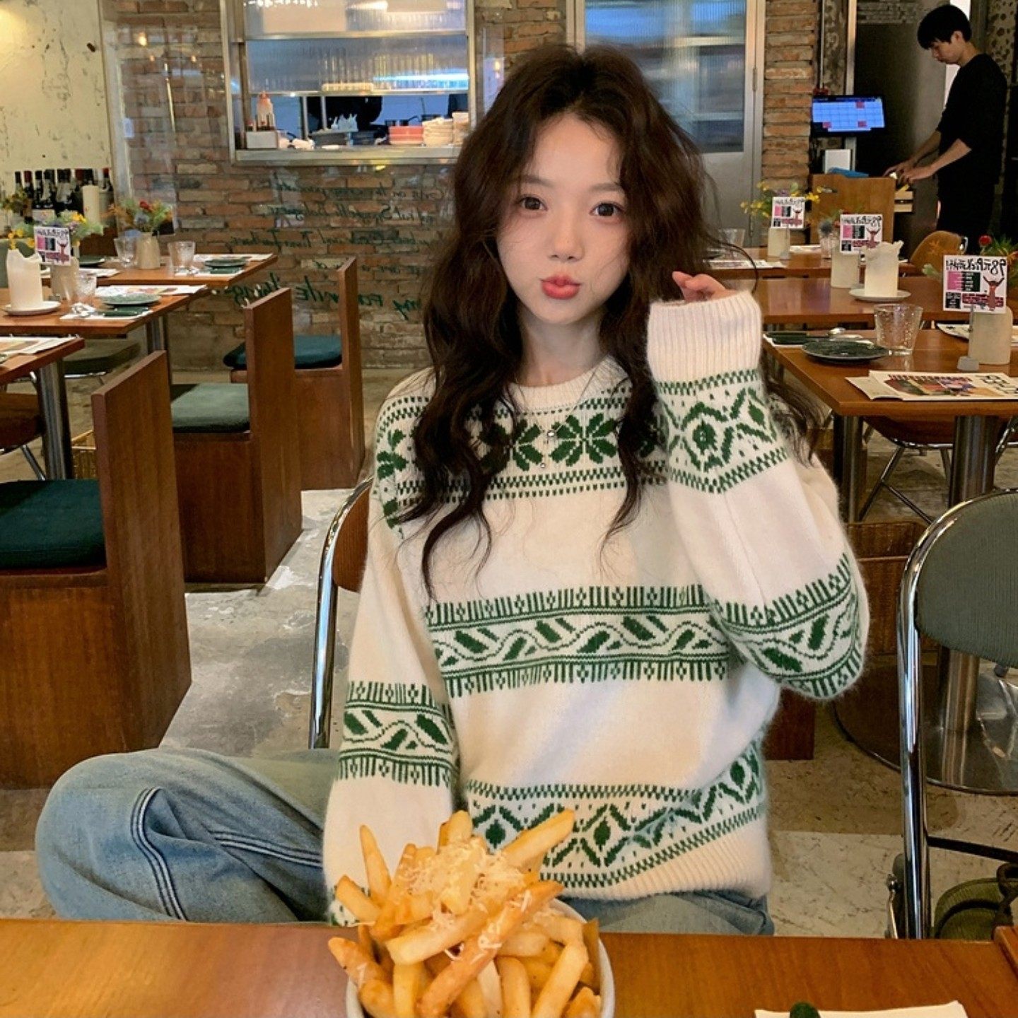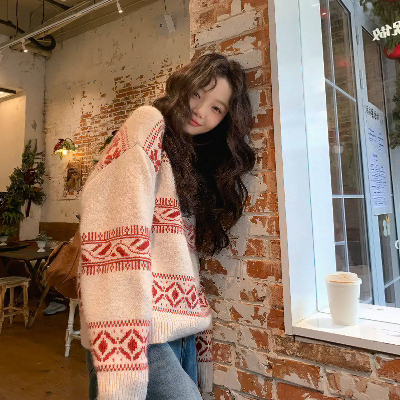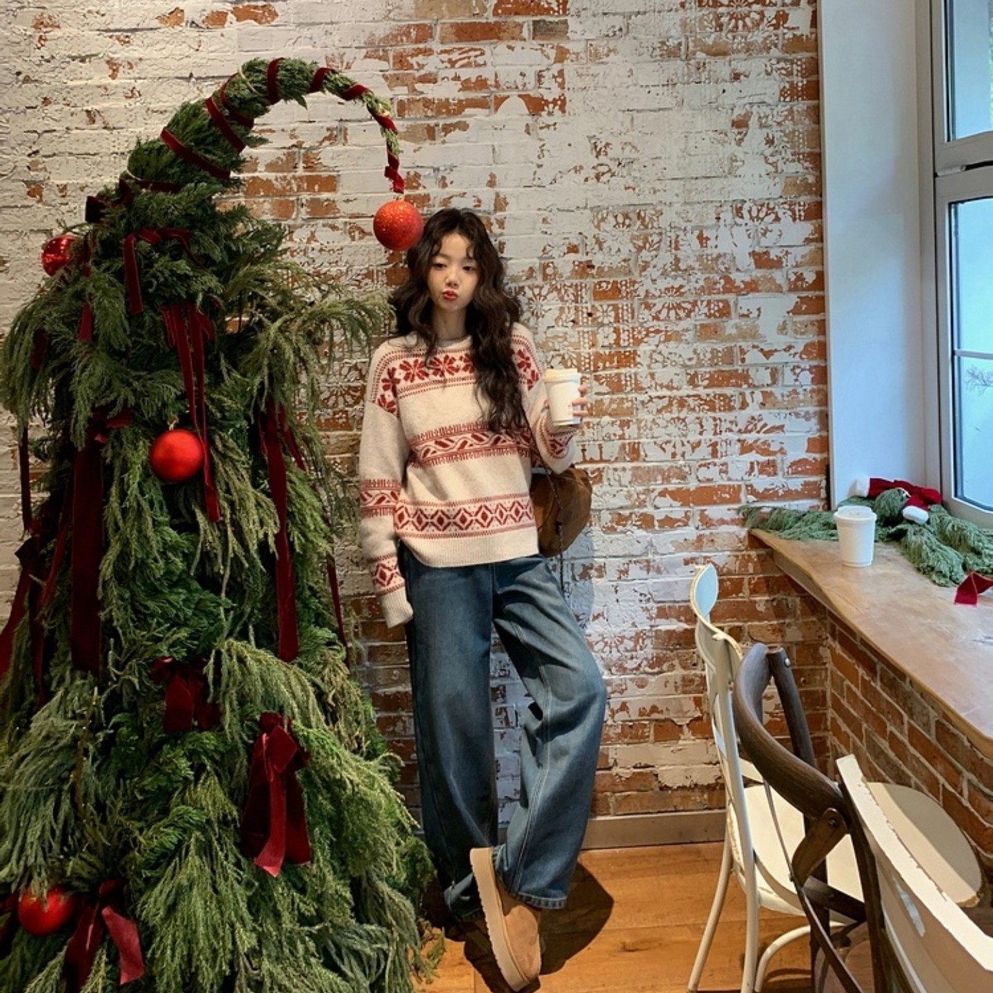 新年战袍红色费尔岛圣诞复古毛衣女秋冬慵懒风过年氛围感穿搭上衣