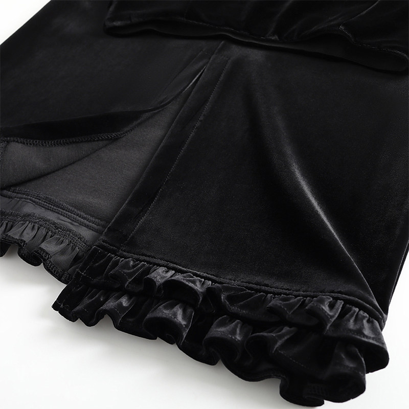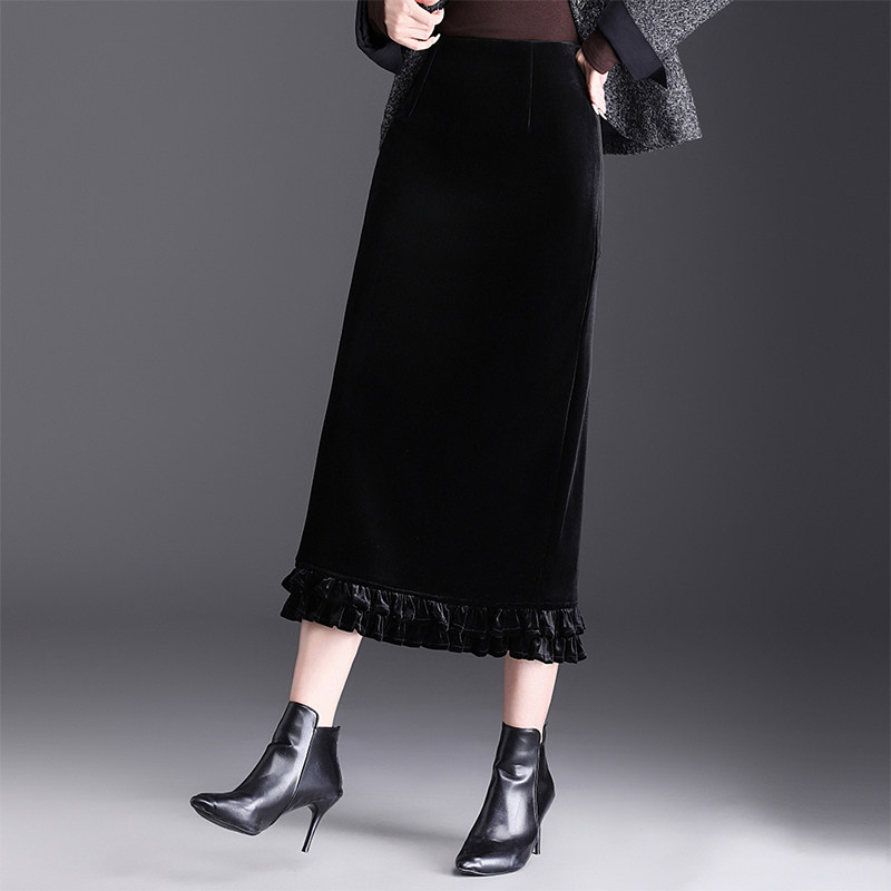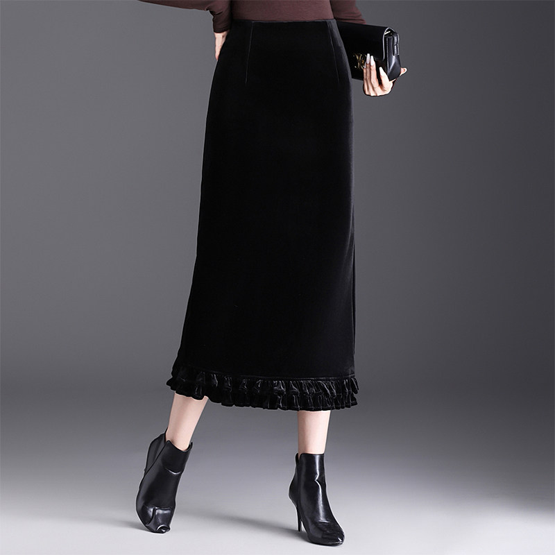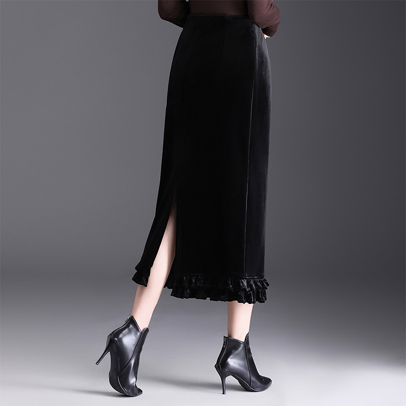 首页> 女装> 黑色加绒金丝绒包臀半身裙女秋冬2025新款显瘦中长款花边直筒裙子