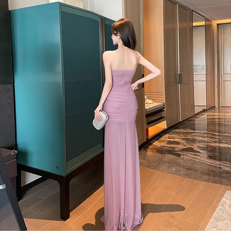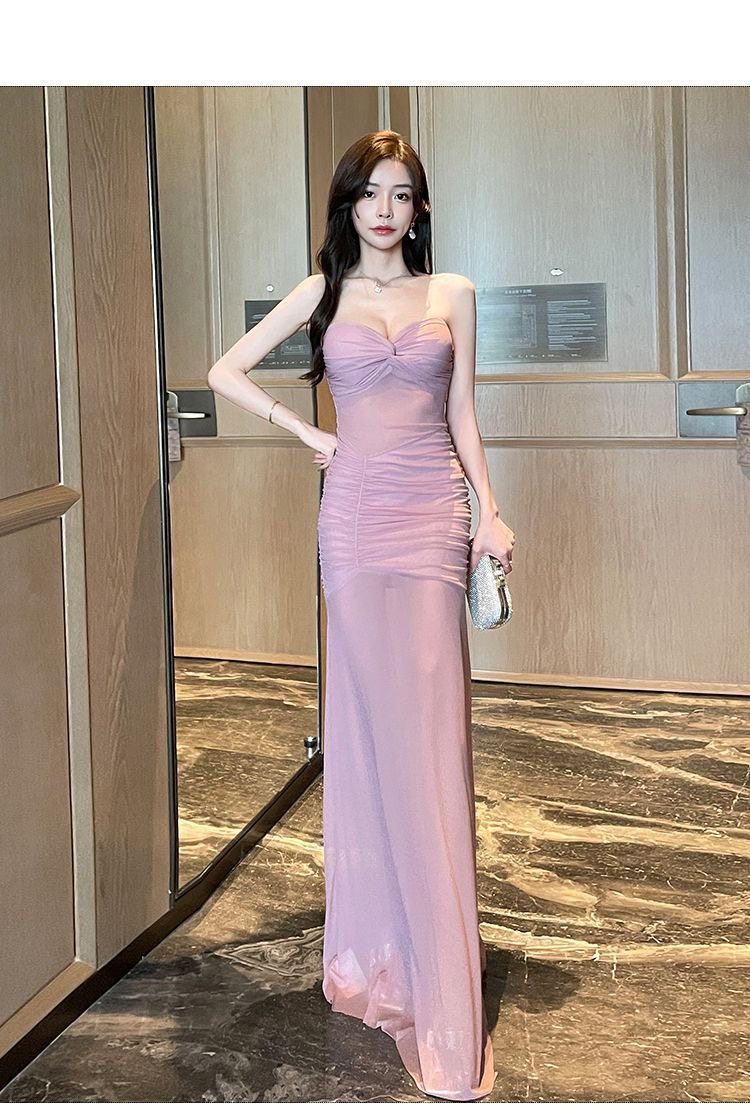 纯欲风褶皱抹胸夜总店性感连衣裙低胸晚礼服显瘦柔式足浴技师长裙