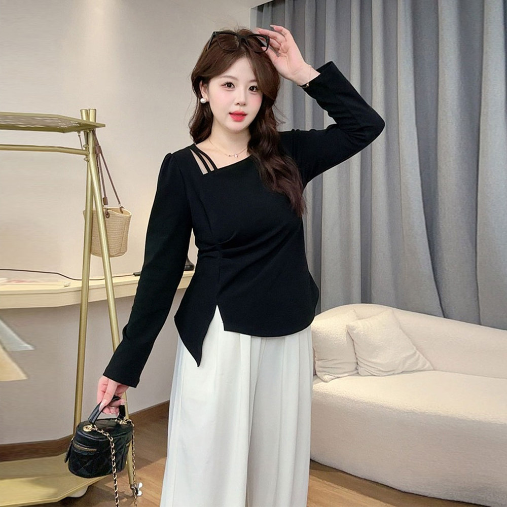 大码胖mm秋季不规则镂空斜领长袖T恤女2025秋冬内搭遮肉显瘦上衣