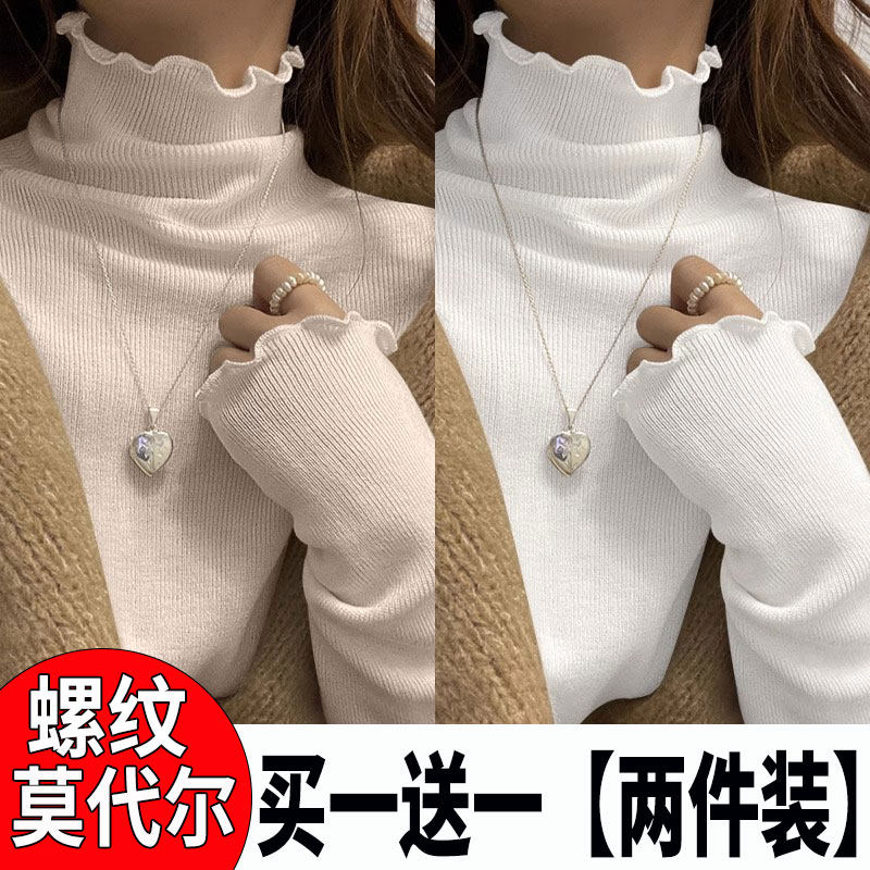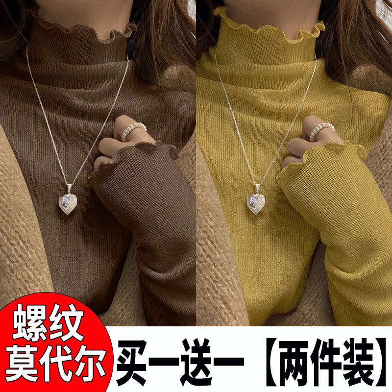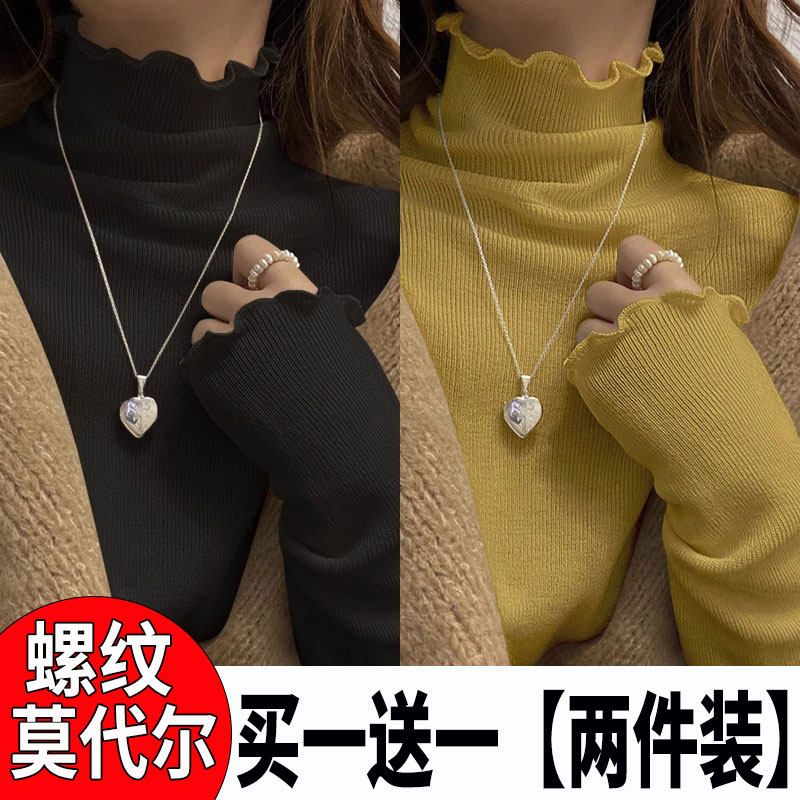 莫代尔木耳边半高领打底衫女秋冬内搭2025新款秋季修身长袖T恤黑