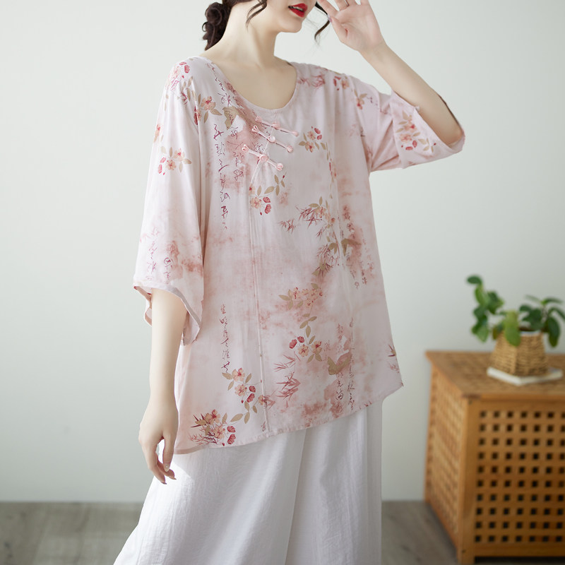 春夏新款新中式盘扣大码女装印花套头胖MM棉绸五分袖T恤中老上衣