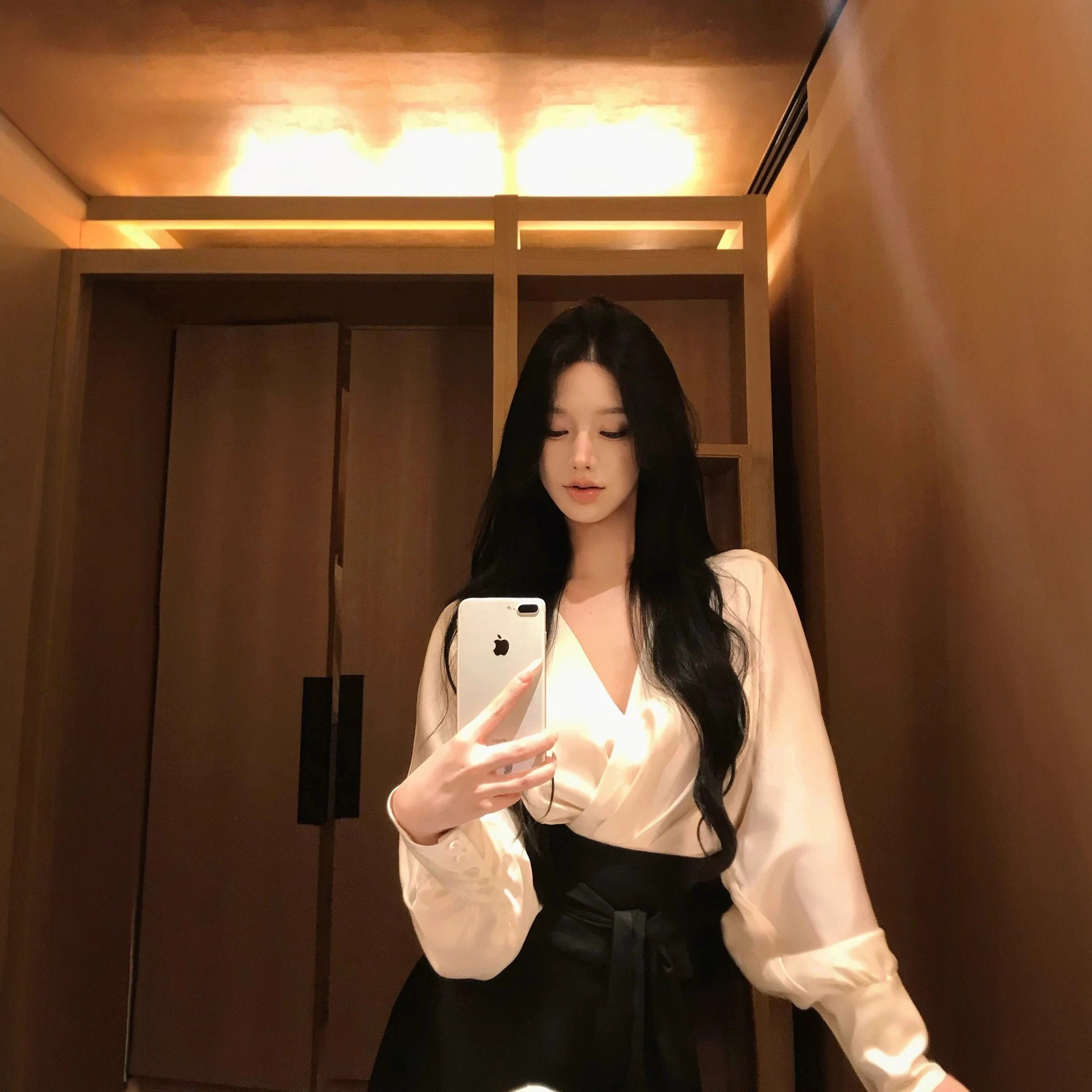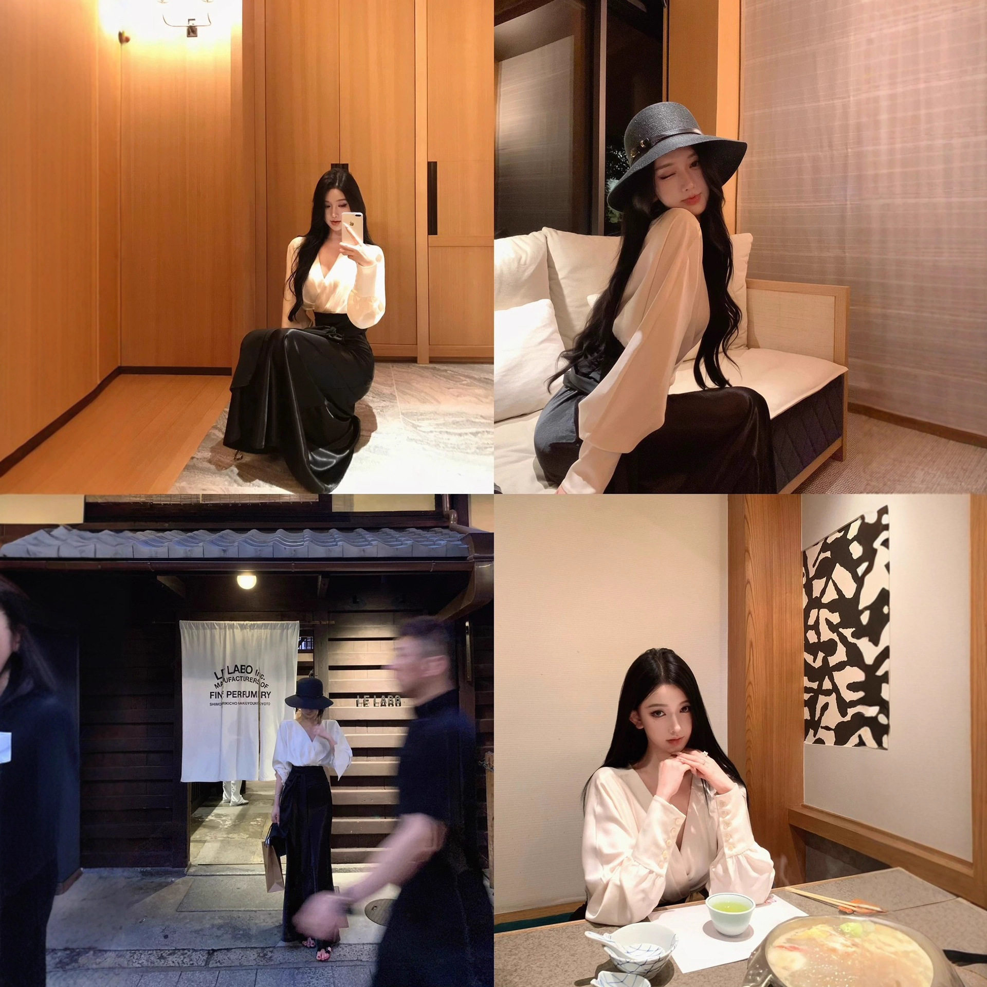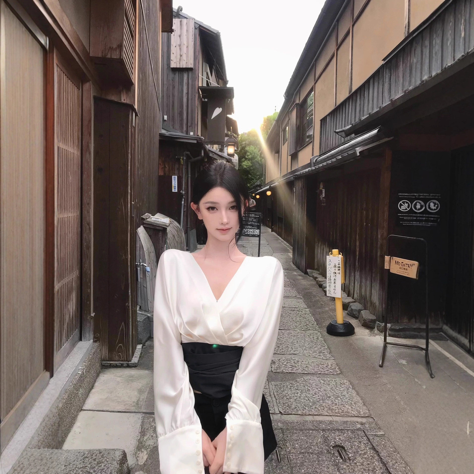 JAYKY YANG赫本小姐撞色V领蝙蝠袖气质衬衫绑带收腰长袖上衣