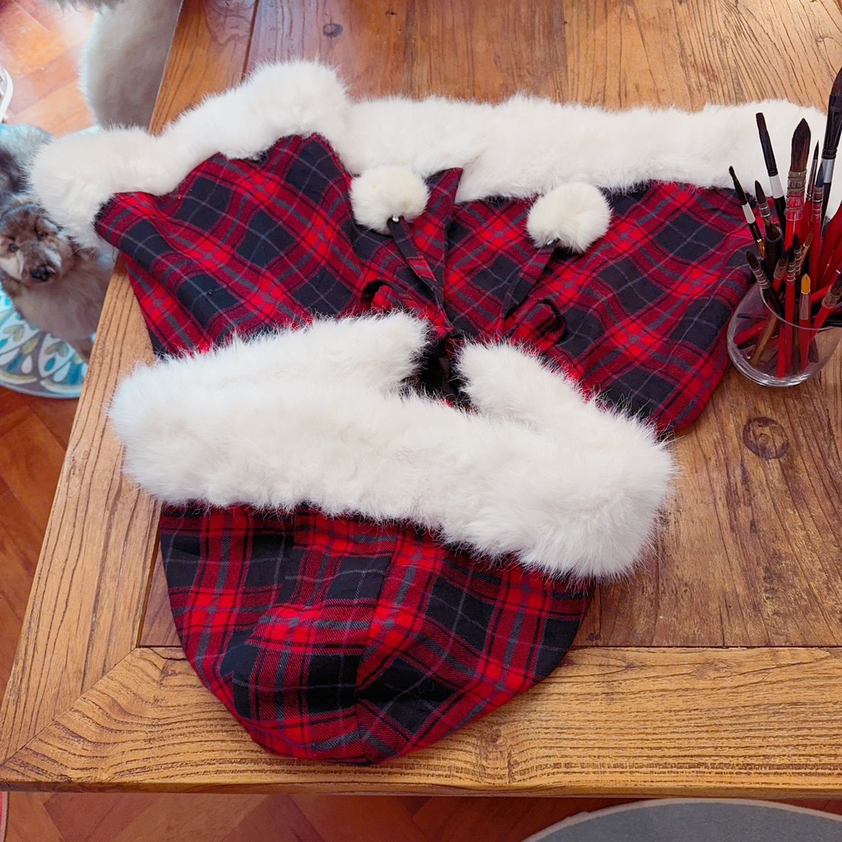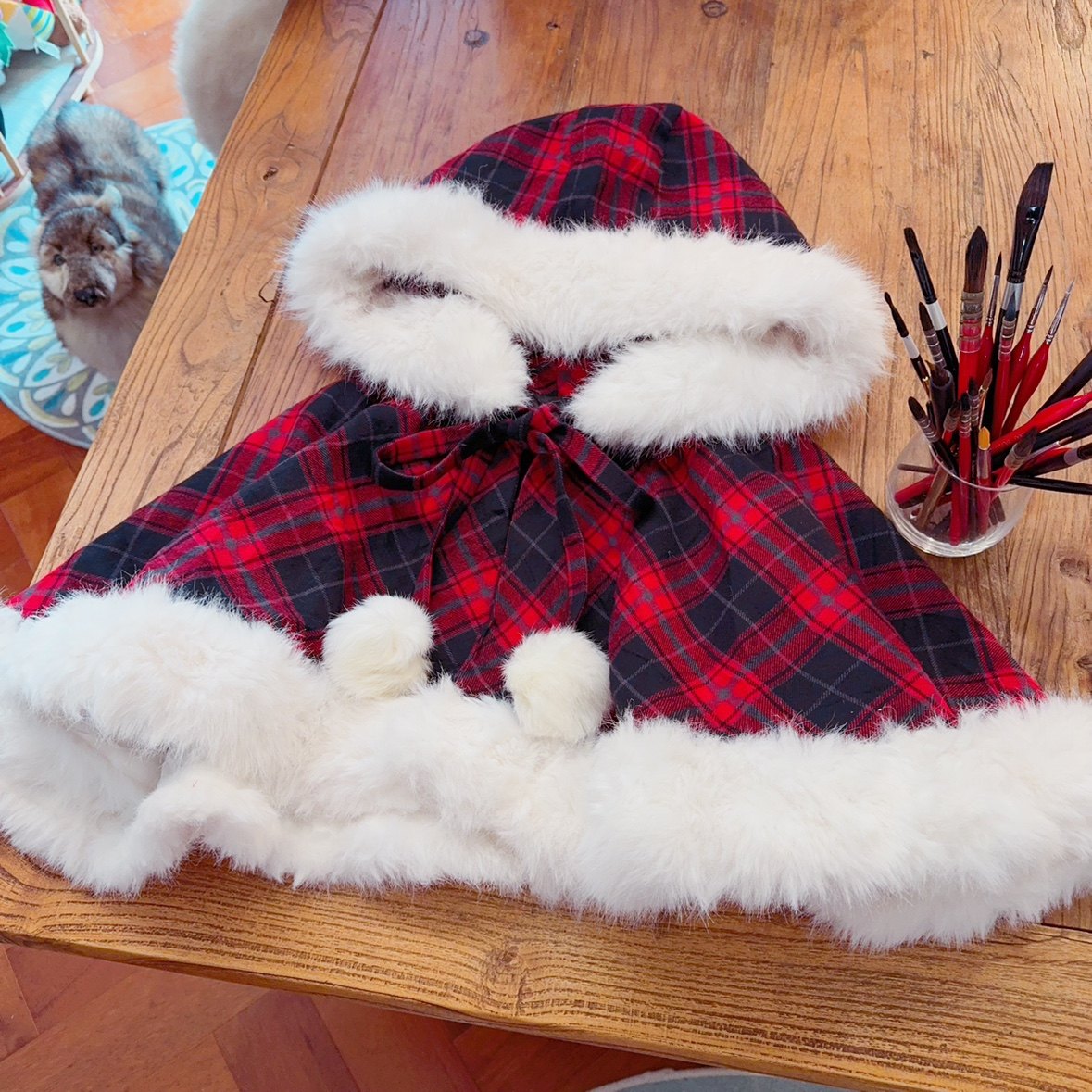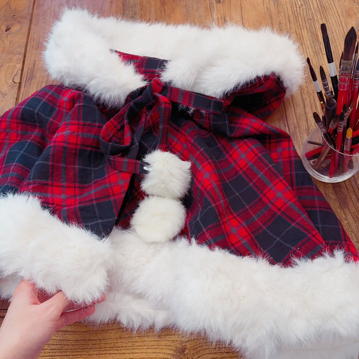外搭好物 毛绒绒 可爱复古红格子 森女田园风 连帽斗篷短外套