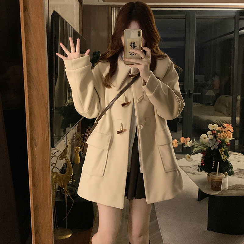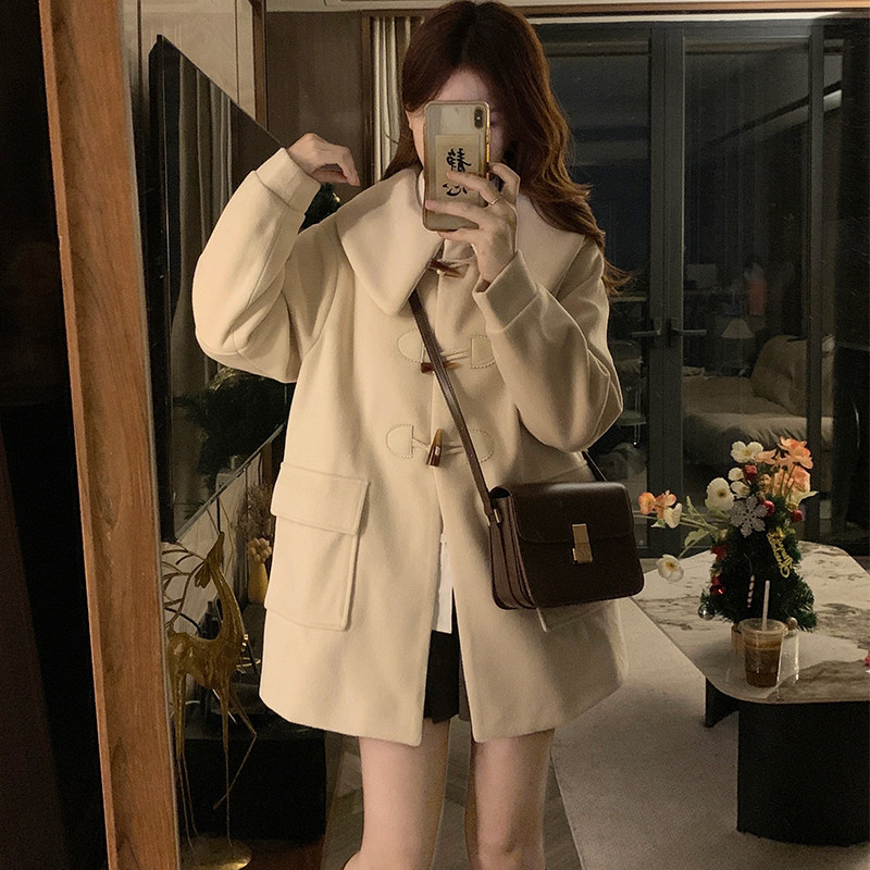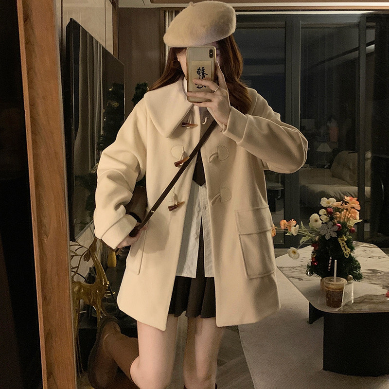 实拍牛角扣小个子新款娃娃领中长款毛呢夹棉加厚外套