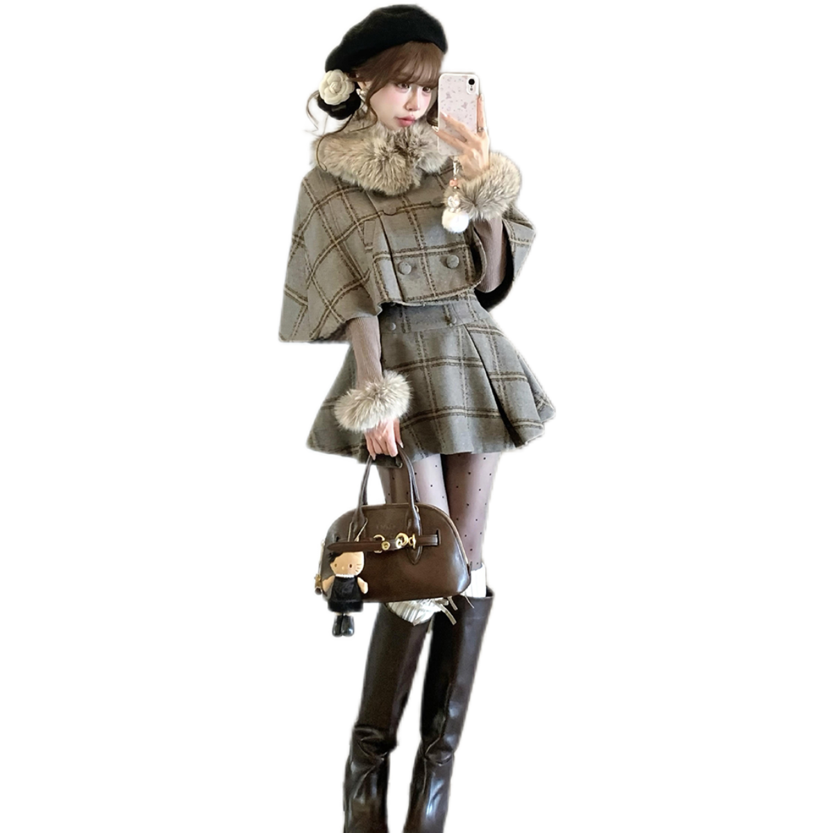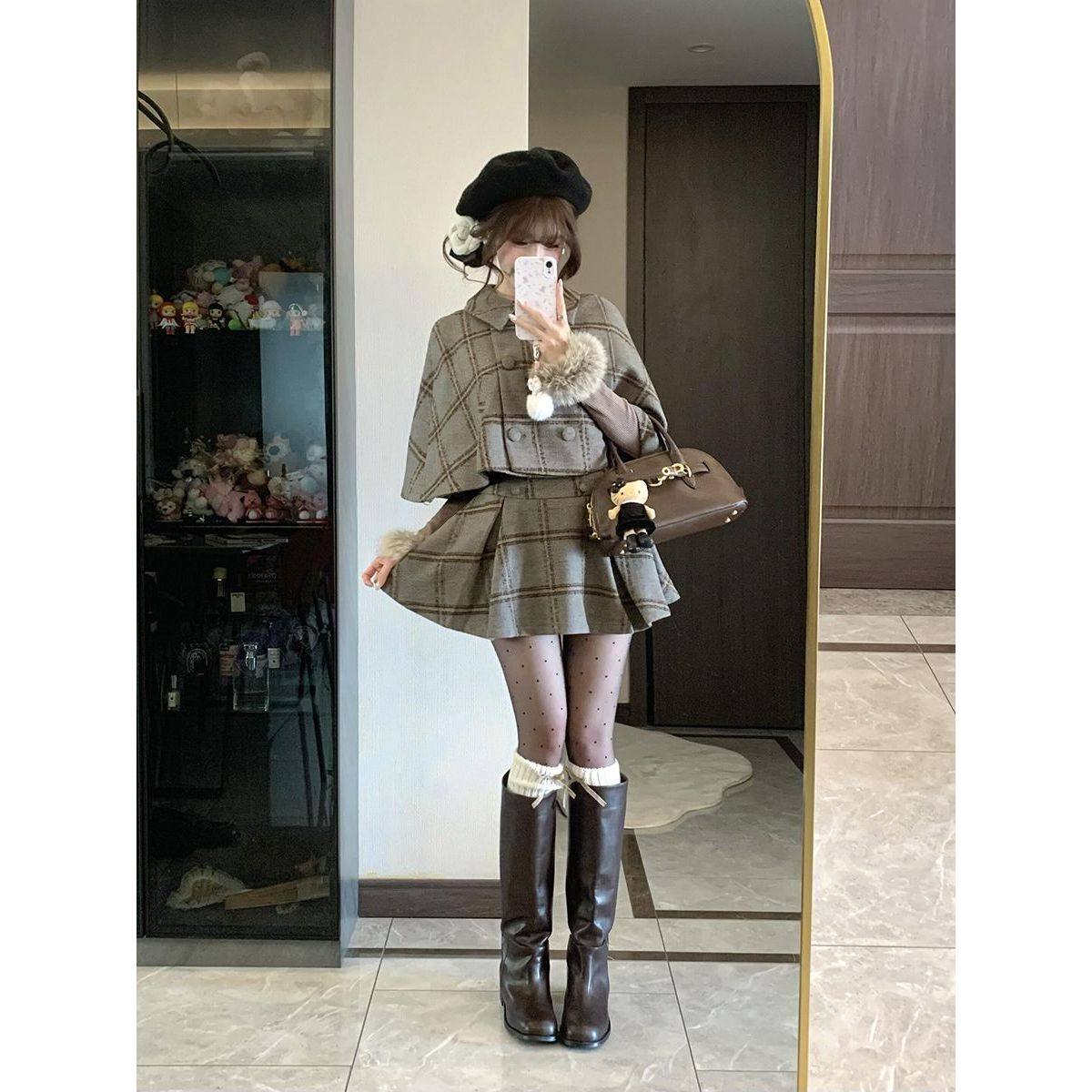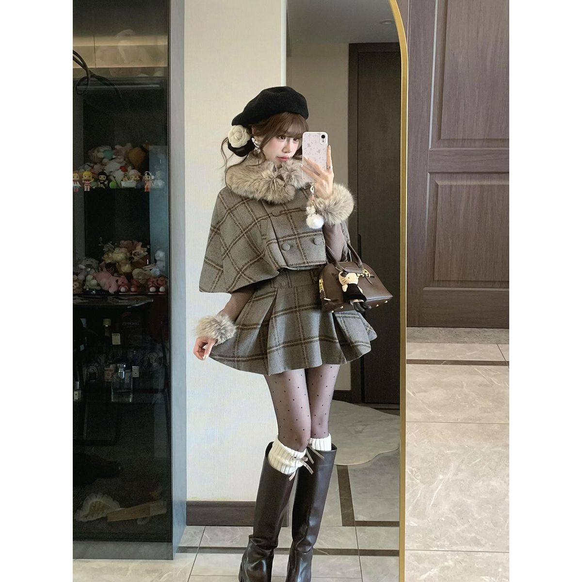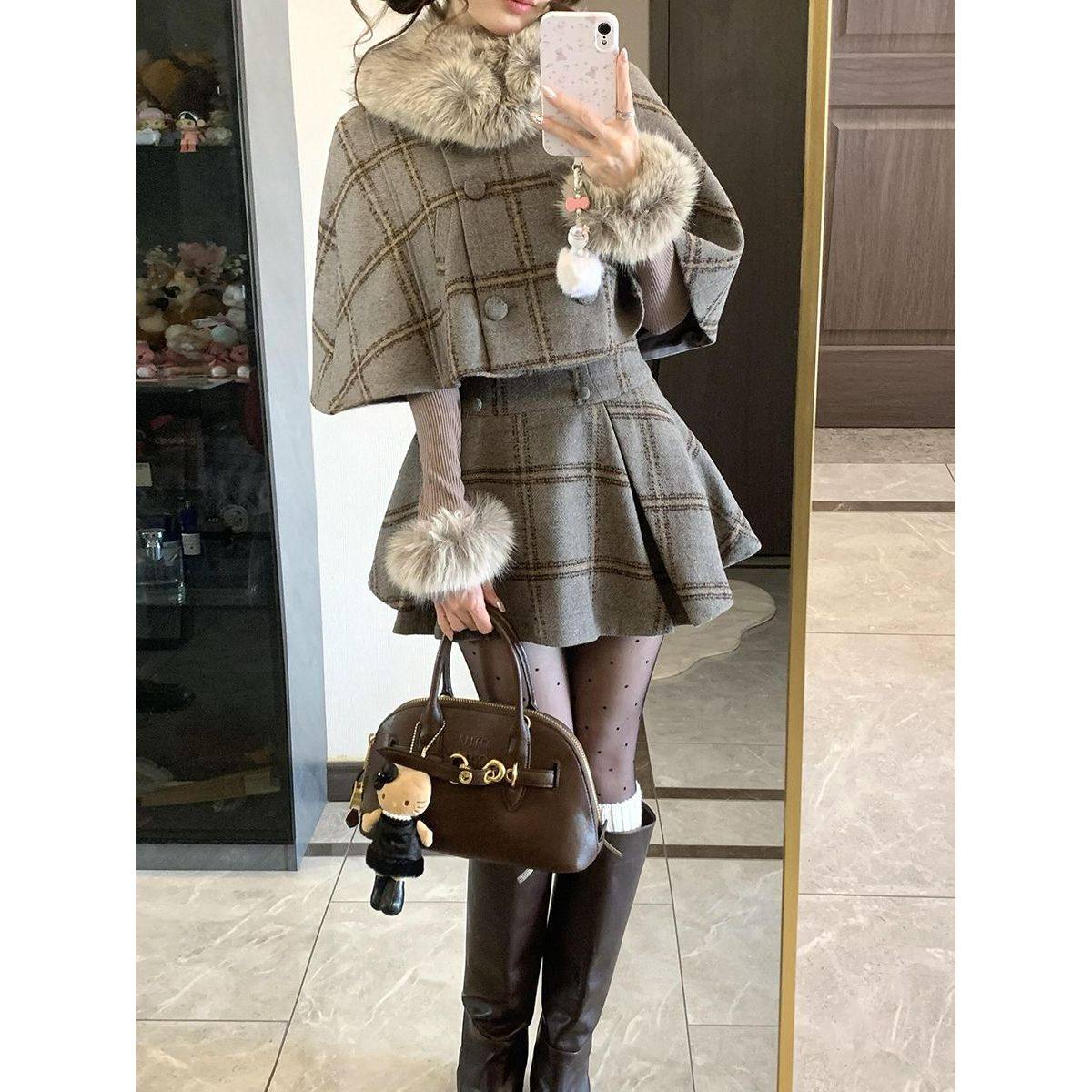 千金复古格纹高级感套装英伦风毛领斗篷半身裙内搭打底新款三件套