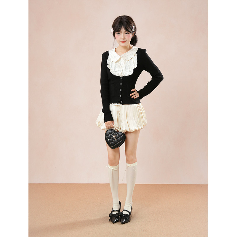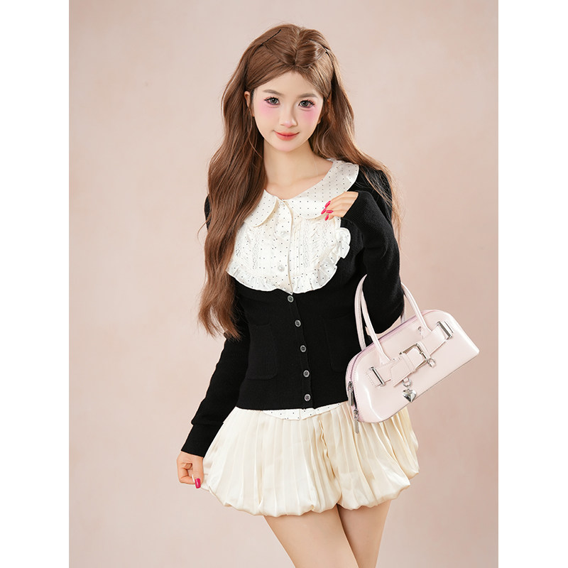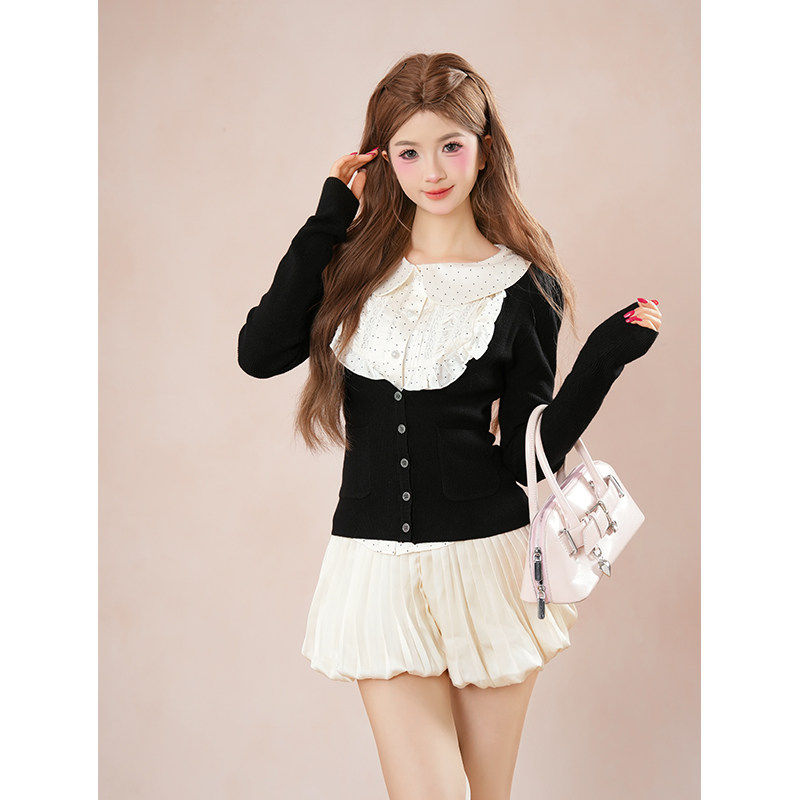 甜撩因子 甜美学院风荷叶边娃娃领背心+针织开衫+花苞裙三件套秋
