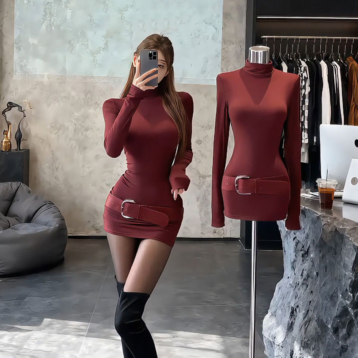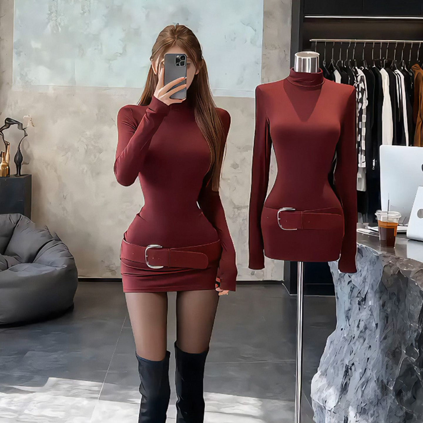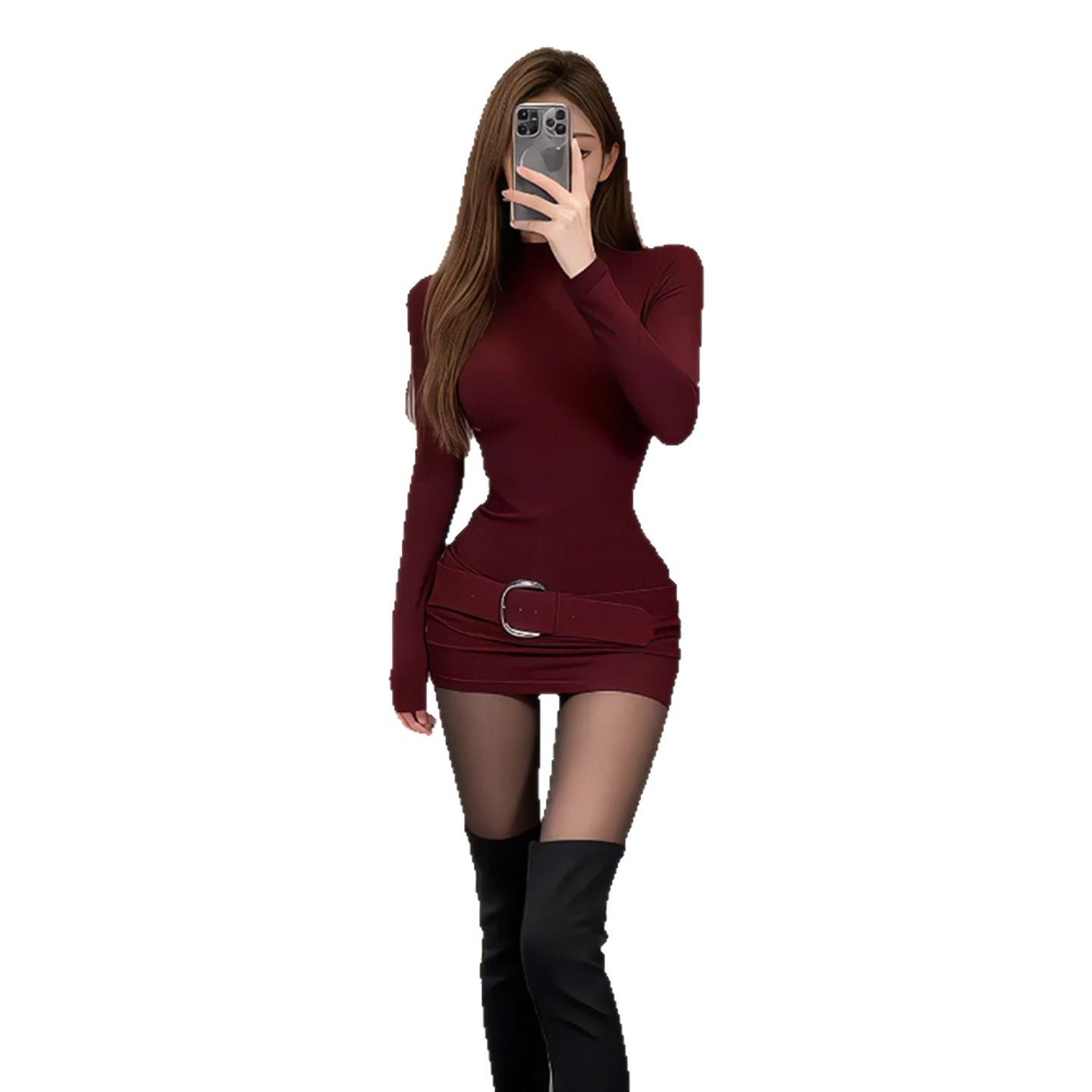 秋冬季新款纯欲辣妹高领收腰纯色连衣裙内搭显瘦弹力百搭包臀短裙