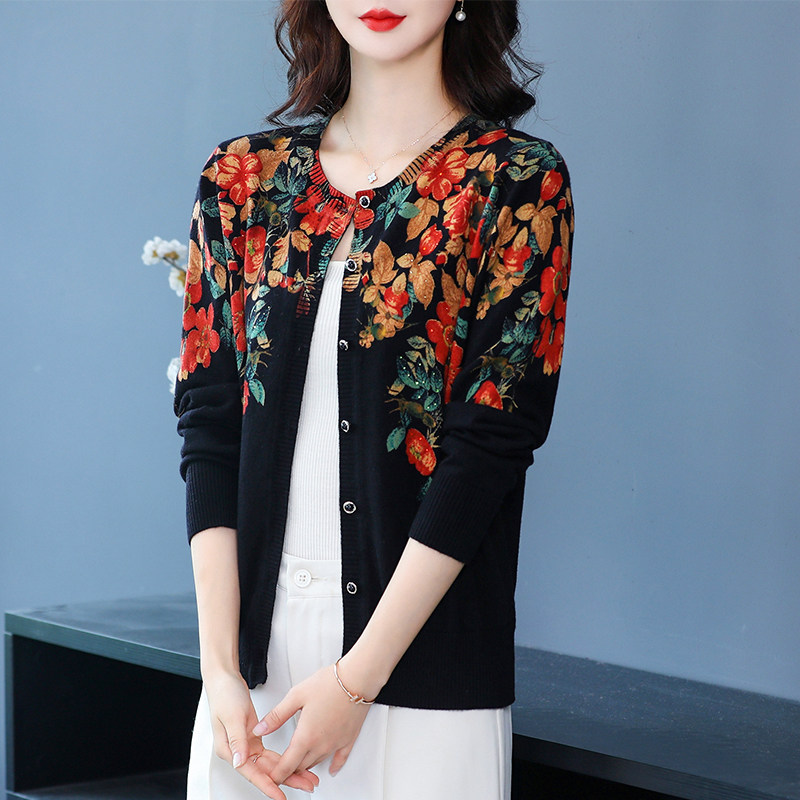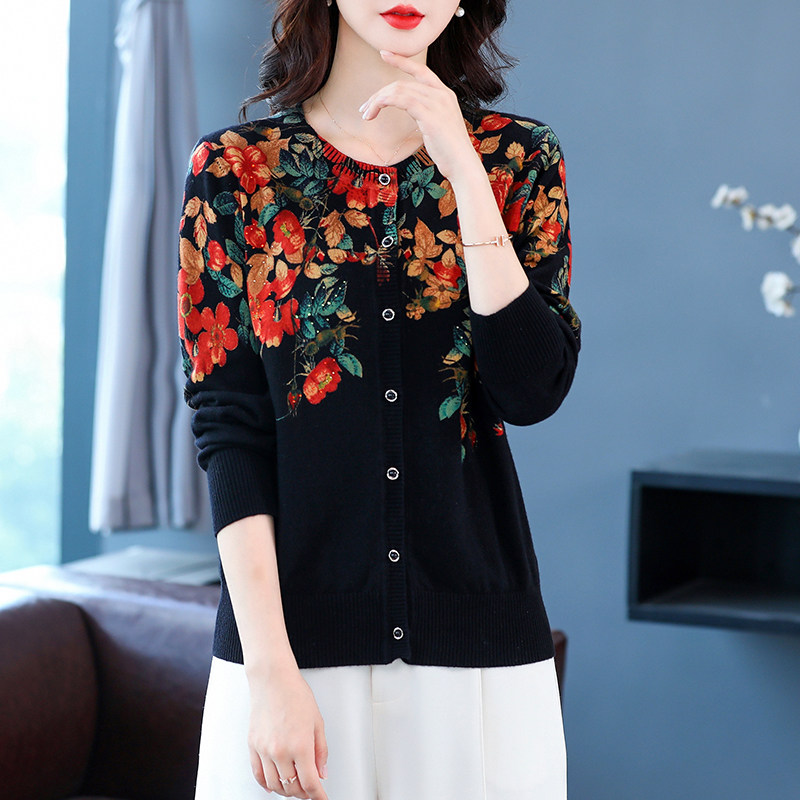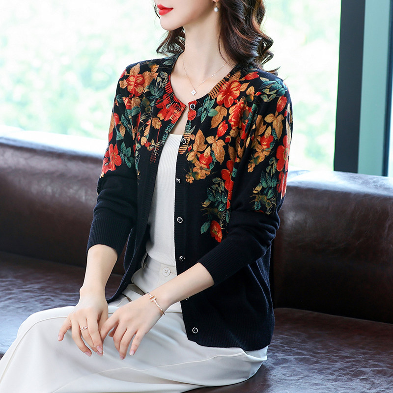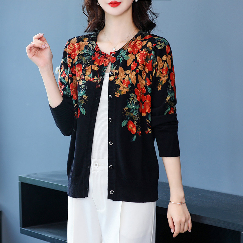 贝蒂卡娜秋冬通勤风印花针织开衫妈妈宽松长袖毛衣洋气时尚