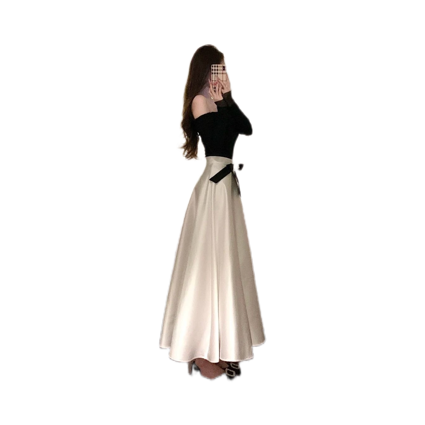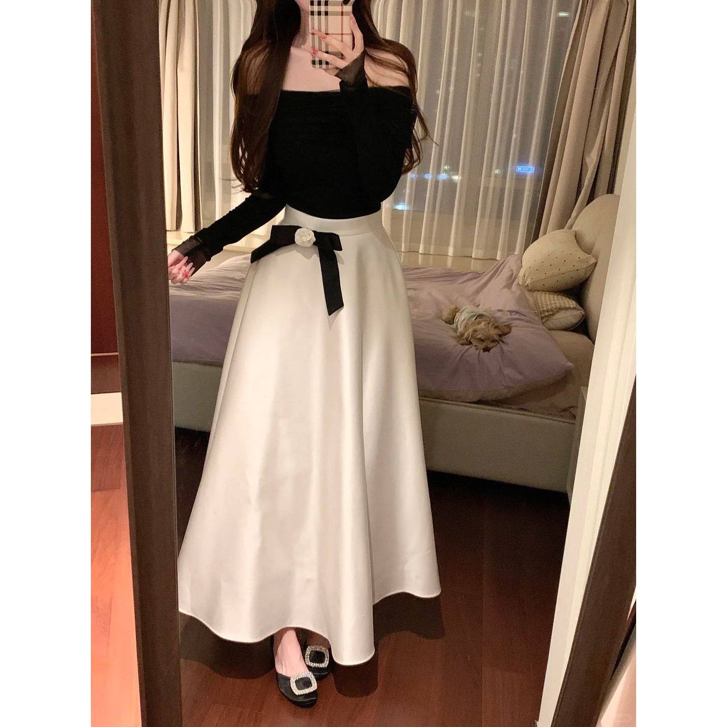 奢雅典范法式高级感网纱褶皱一字肩针织上衣大摆半身裙套