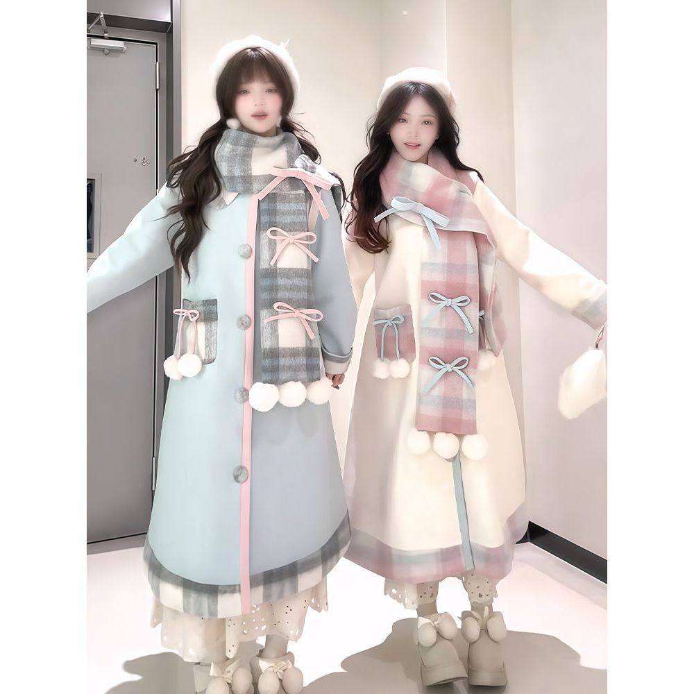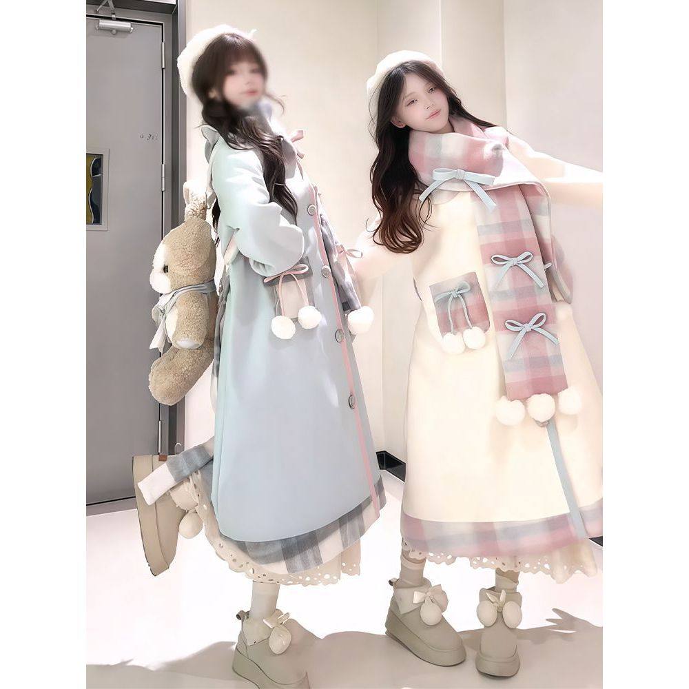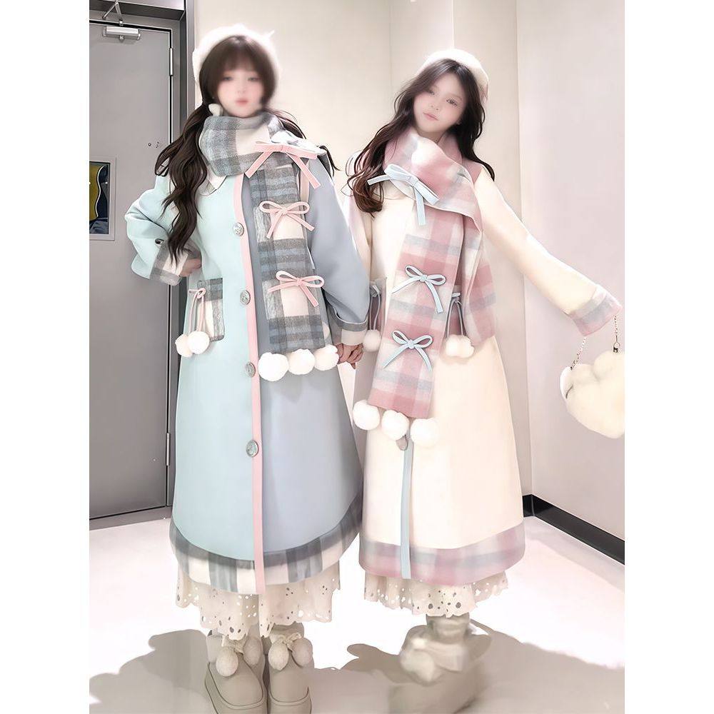 【奶油日记】2025年秋冬可爱蝴蝶结格子甜美少女围巾毛呢长款大衣