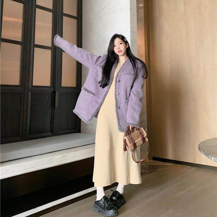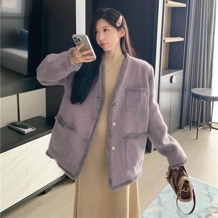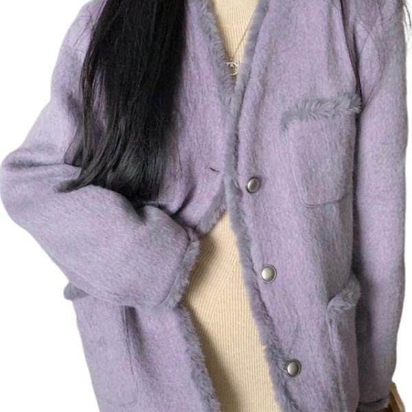 2025秋季新款小香风复古设计感百搭V领灰紫色毛呢外套上衣女