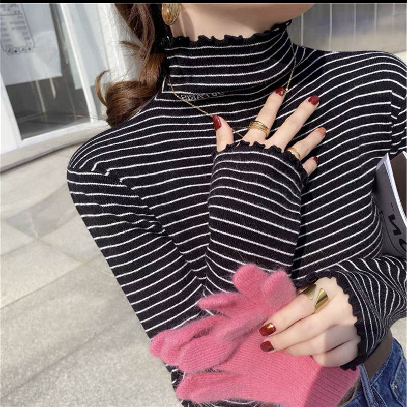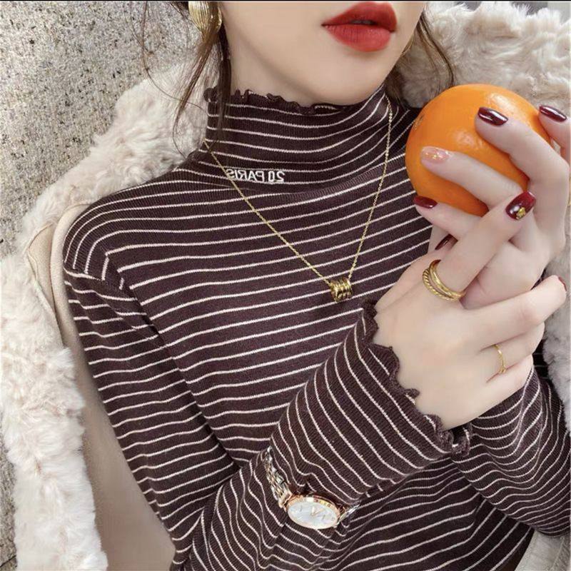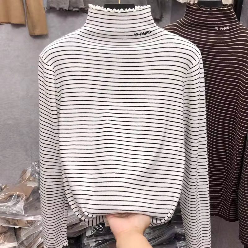 条纹半高领德绒打底衫女2025新款秋冬内搭加厚保暖磨毛长袖上衣服
