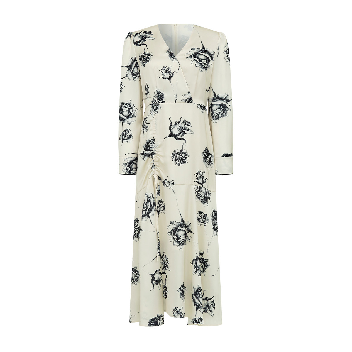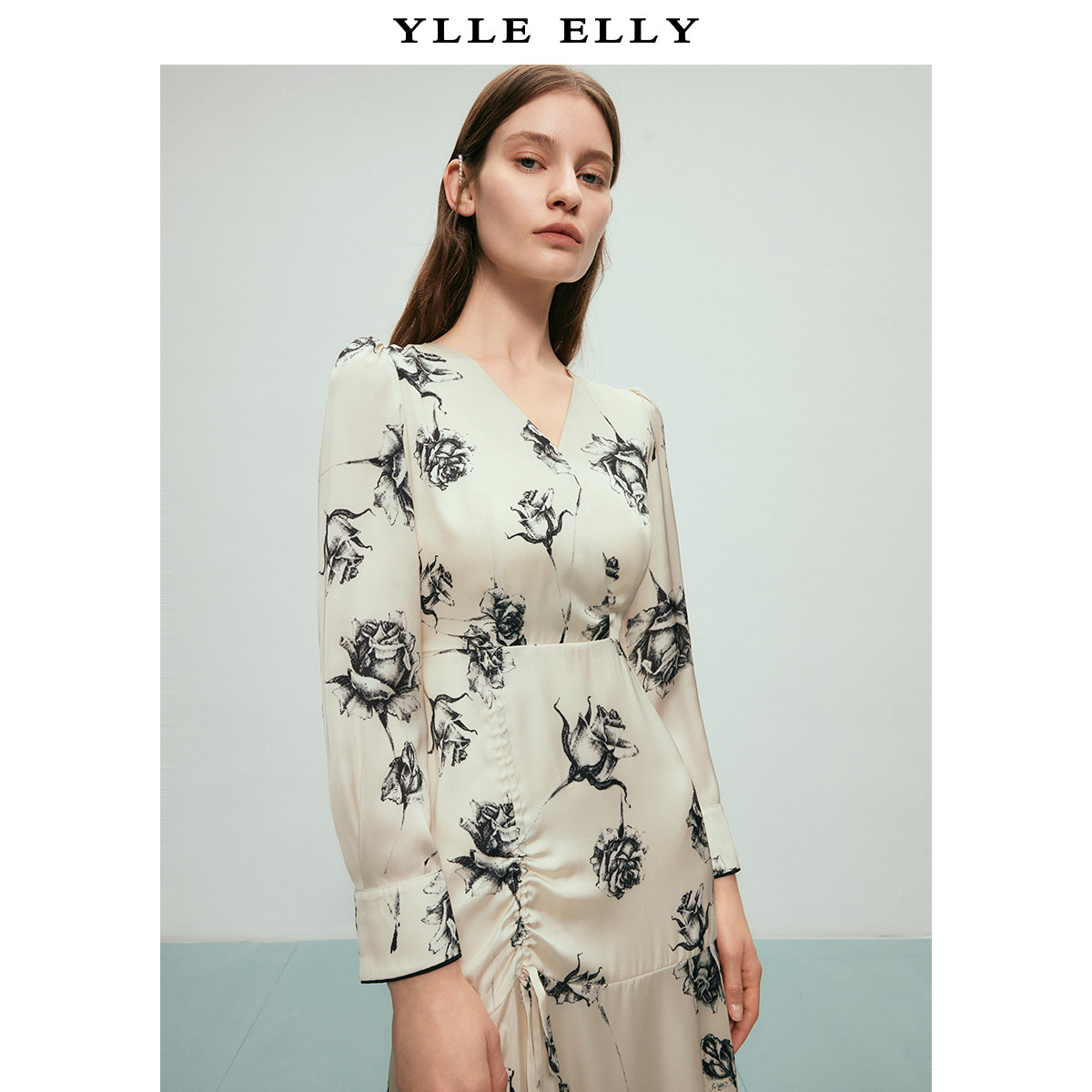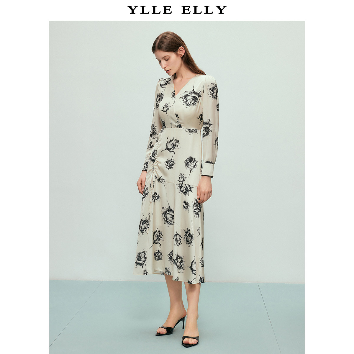 【粉丝专属】玫瑰印花连衣裙2025春季新款V领收腰抽褶