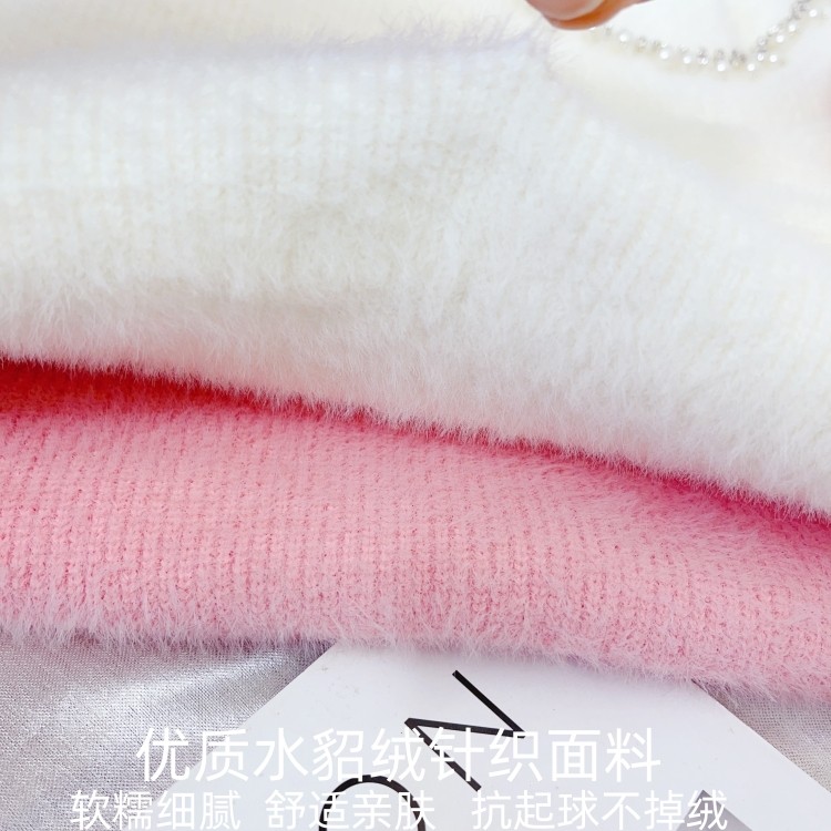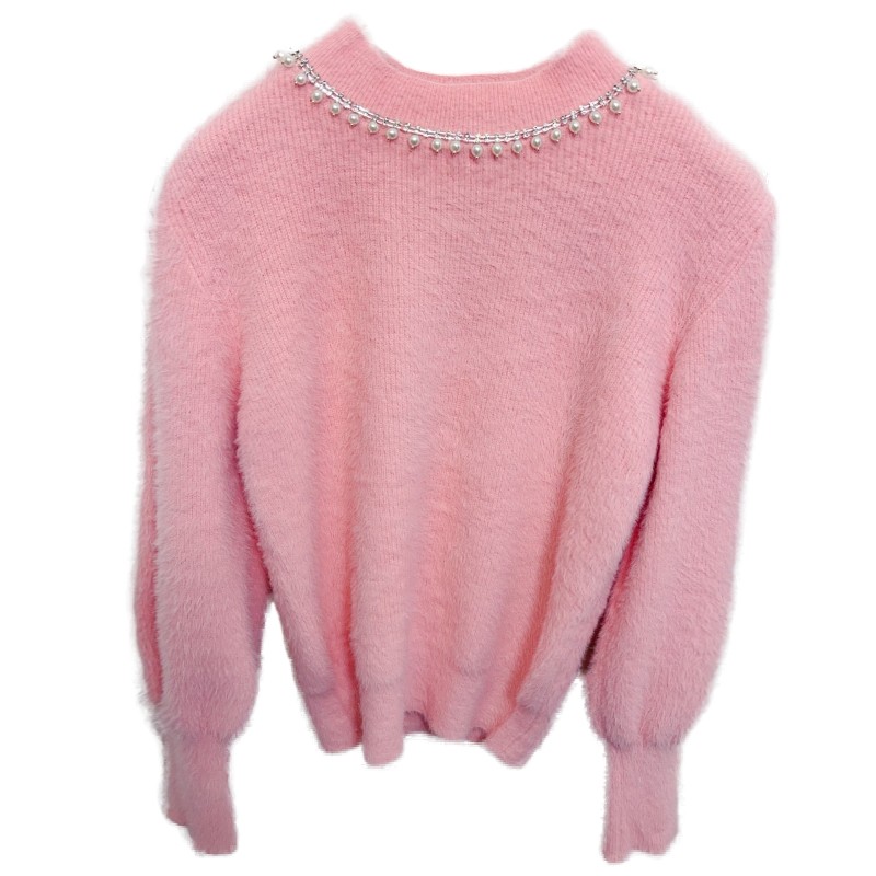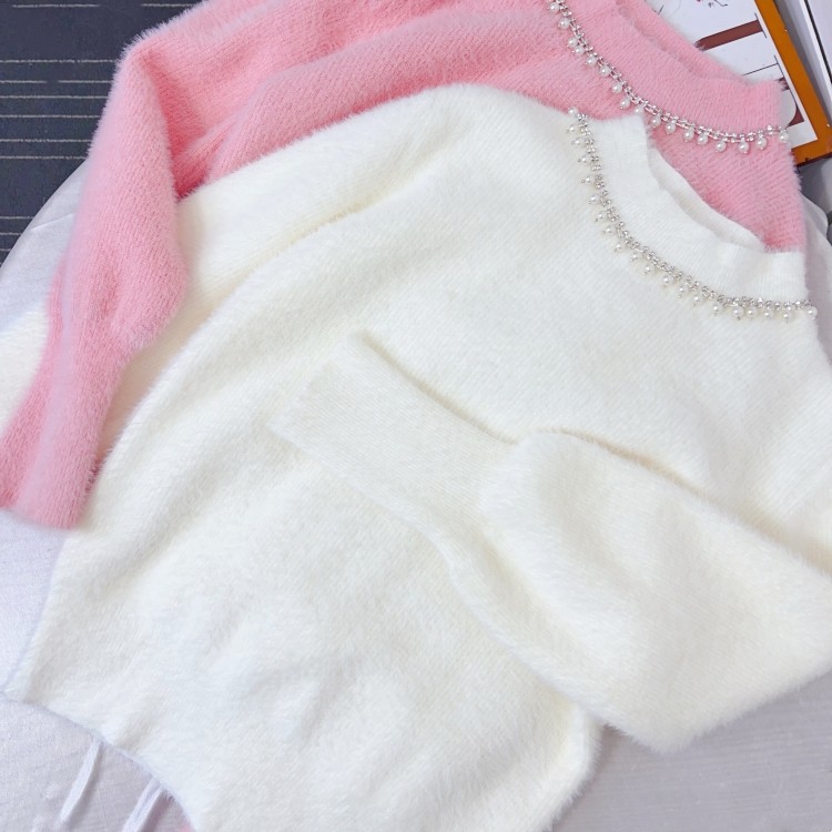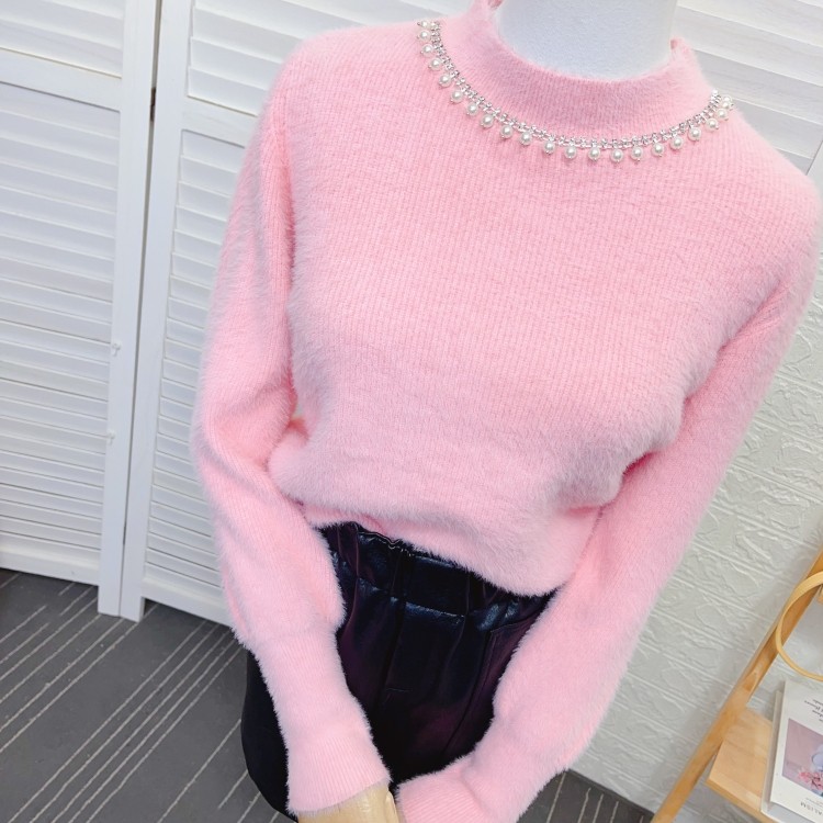 珍珠镶钻半高领水貂绒毛衣女装秋冬新款加厚马海毛打底针织衫上衣