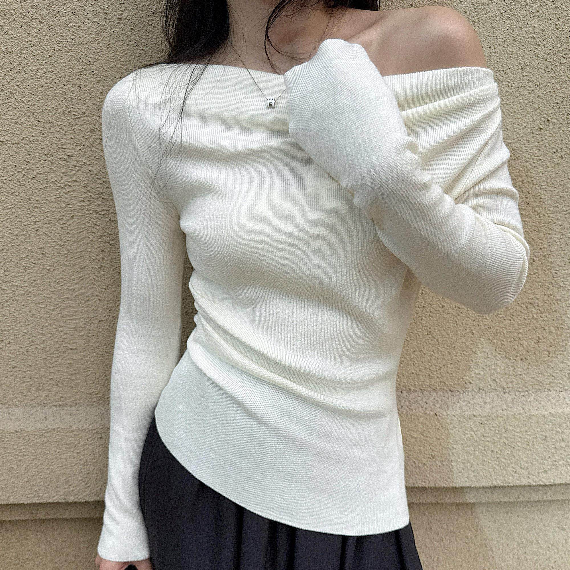 郑chenchen红色一字肩毛衣女秋冬高级感露肩斜肩修身针织长袖上衣