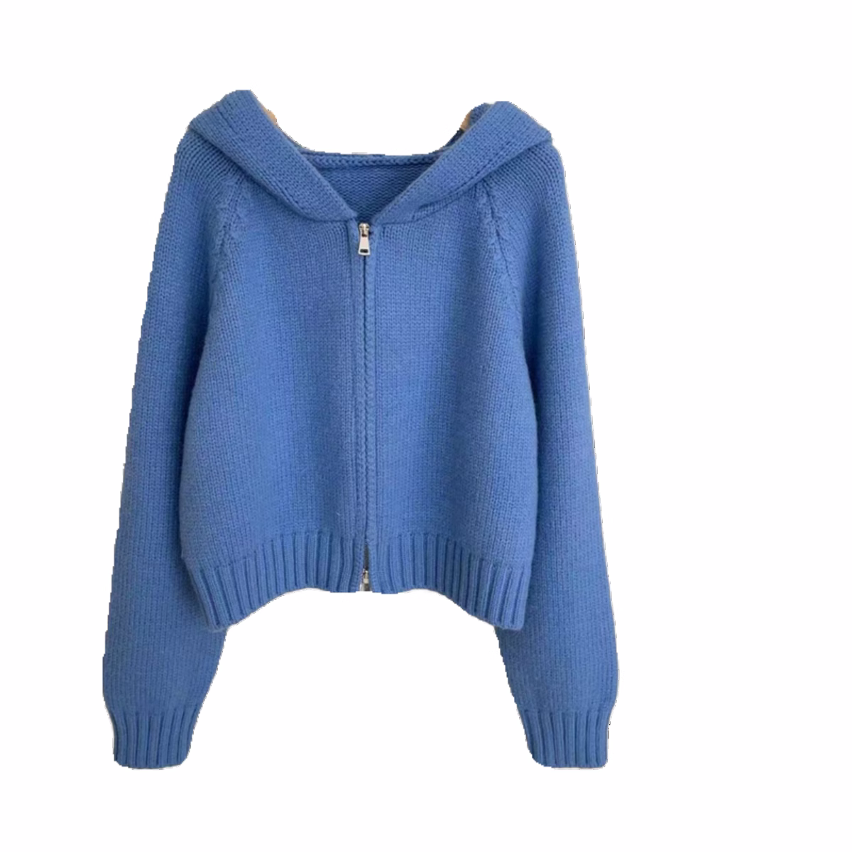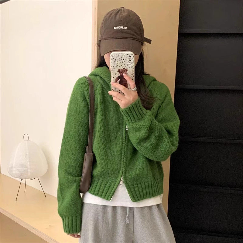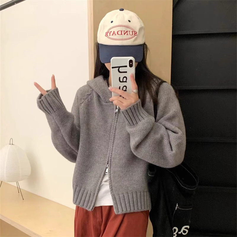 连帽针织开衫女秋冬装韩系慵懒风宽松加厚毛衣短款卫衣双拉链外套