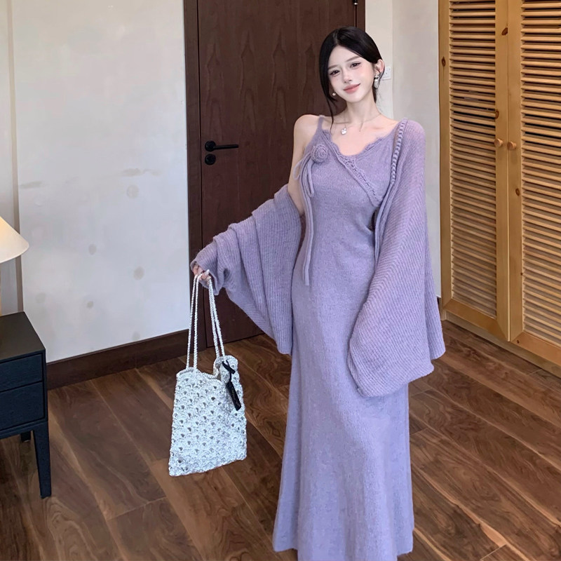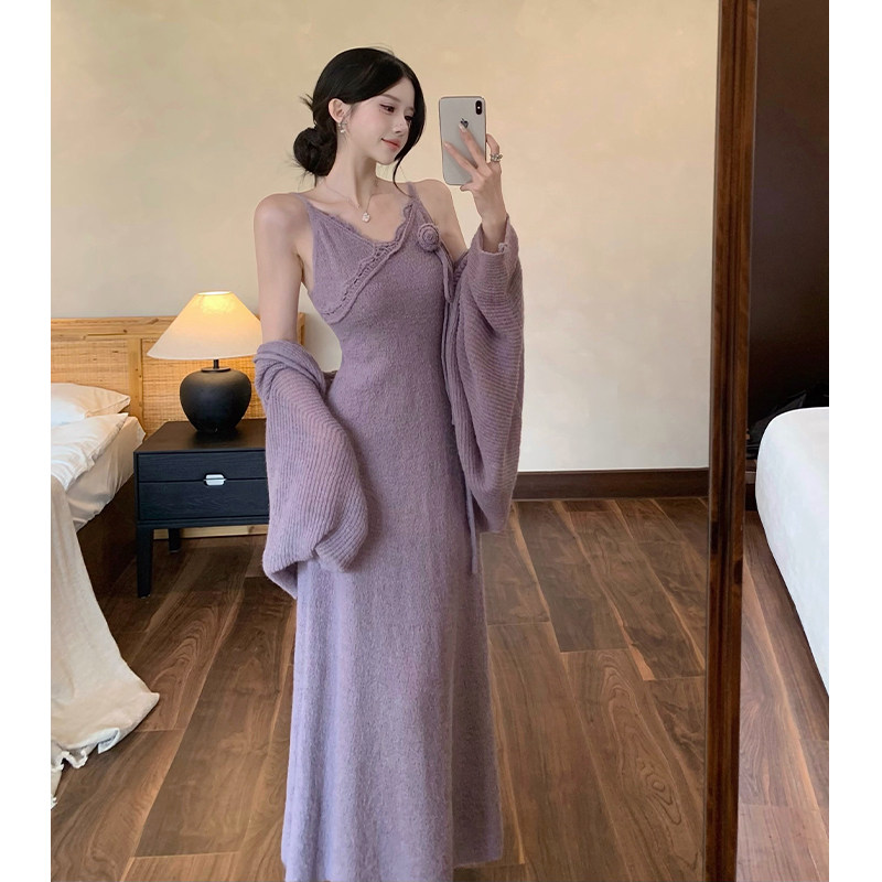 软儒慵懒花朵针织吊带连衣裙开衫毛衣外套时尚气质两件套高级感