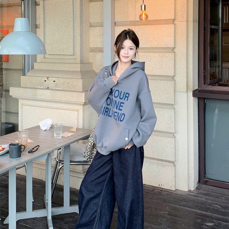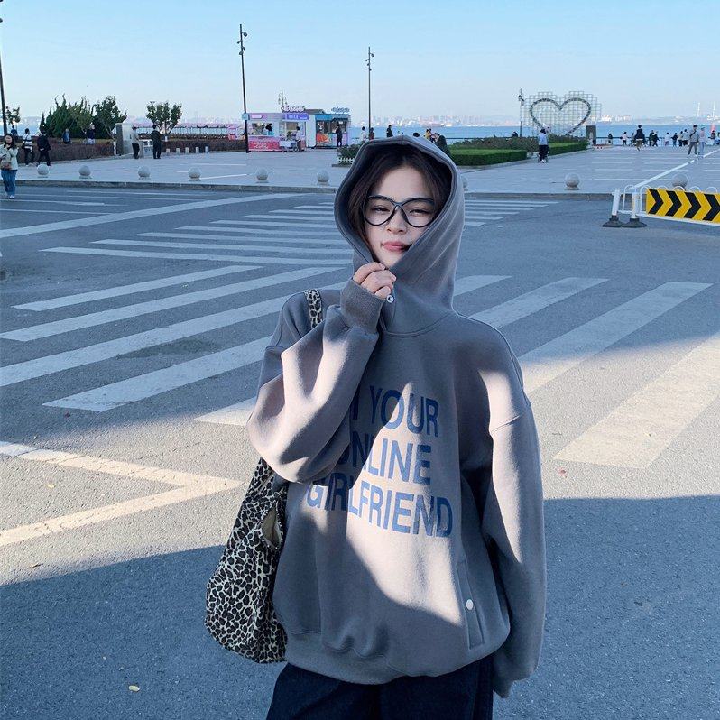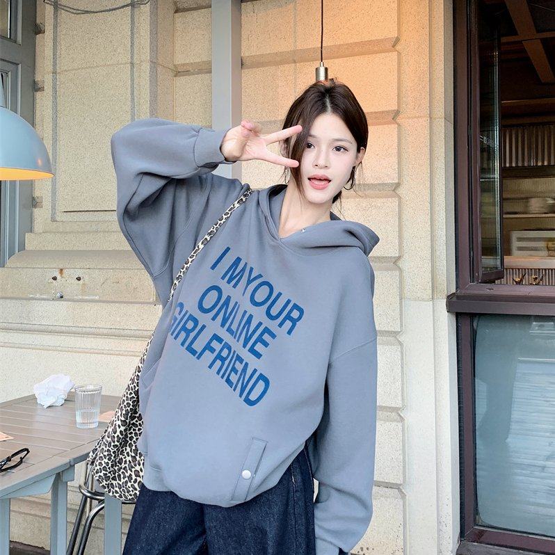 实拍 秋冬韩系设计感印花休闲百搭时尚情侣连帽卫衣