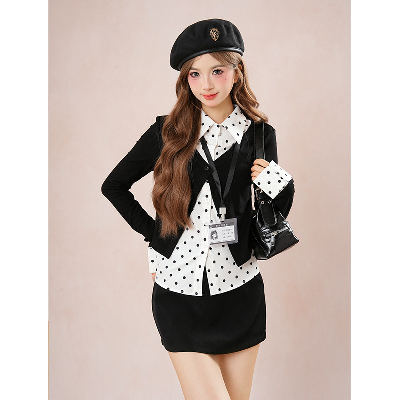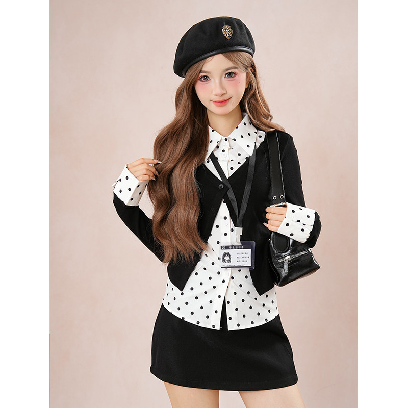 韩系波点氛围感套装 日系复古假两件上衣+短裙两件套2025秋小个子