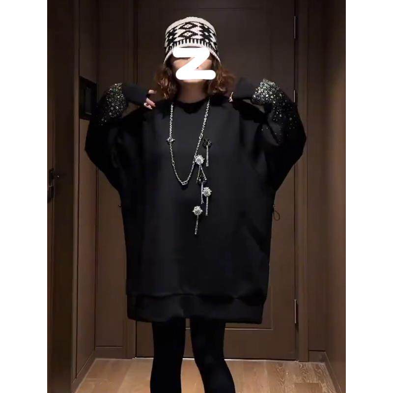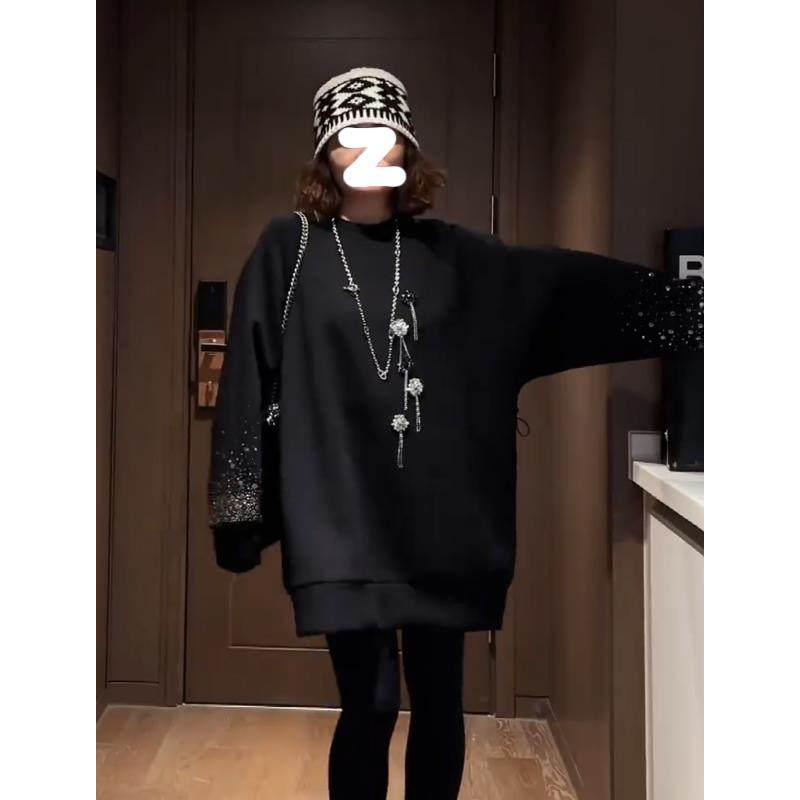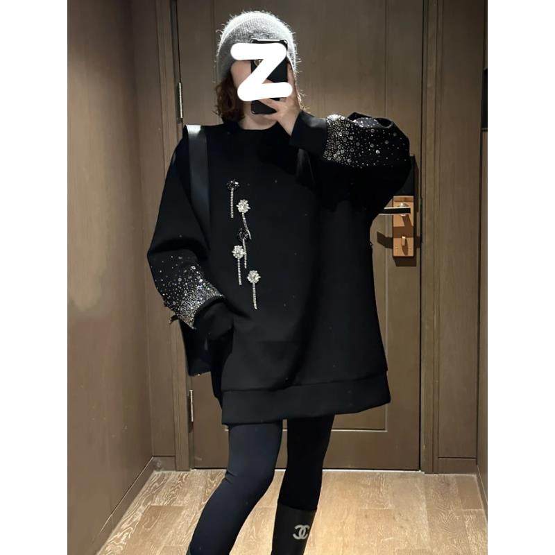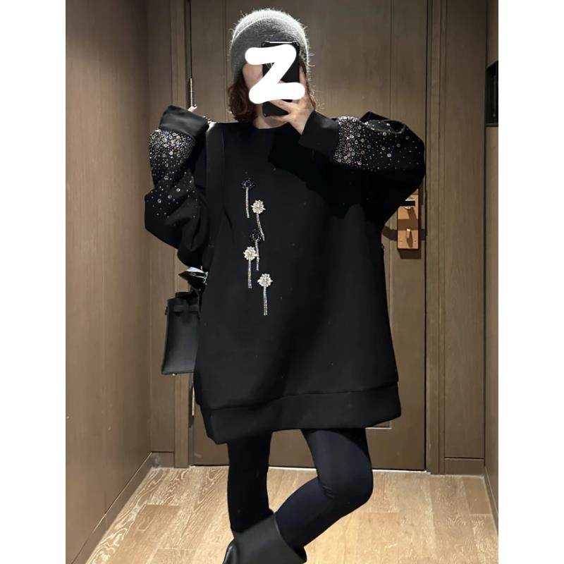 首页> 女装> 欧洲站袖口亮钻重工卫衣裙女2025年秋季大码胖MM圆领宽松花朵上衣