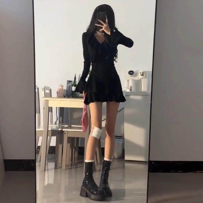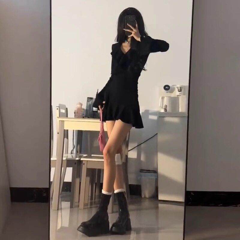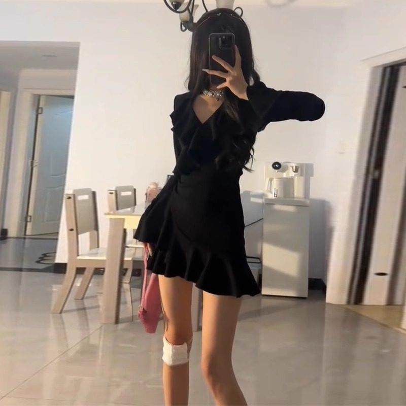 首页> 女装> 日系纯欲V领连衣裙女春秋新款风情万种芭蕾风包臀裙赫本风小黑裙