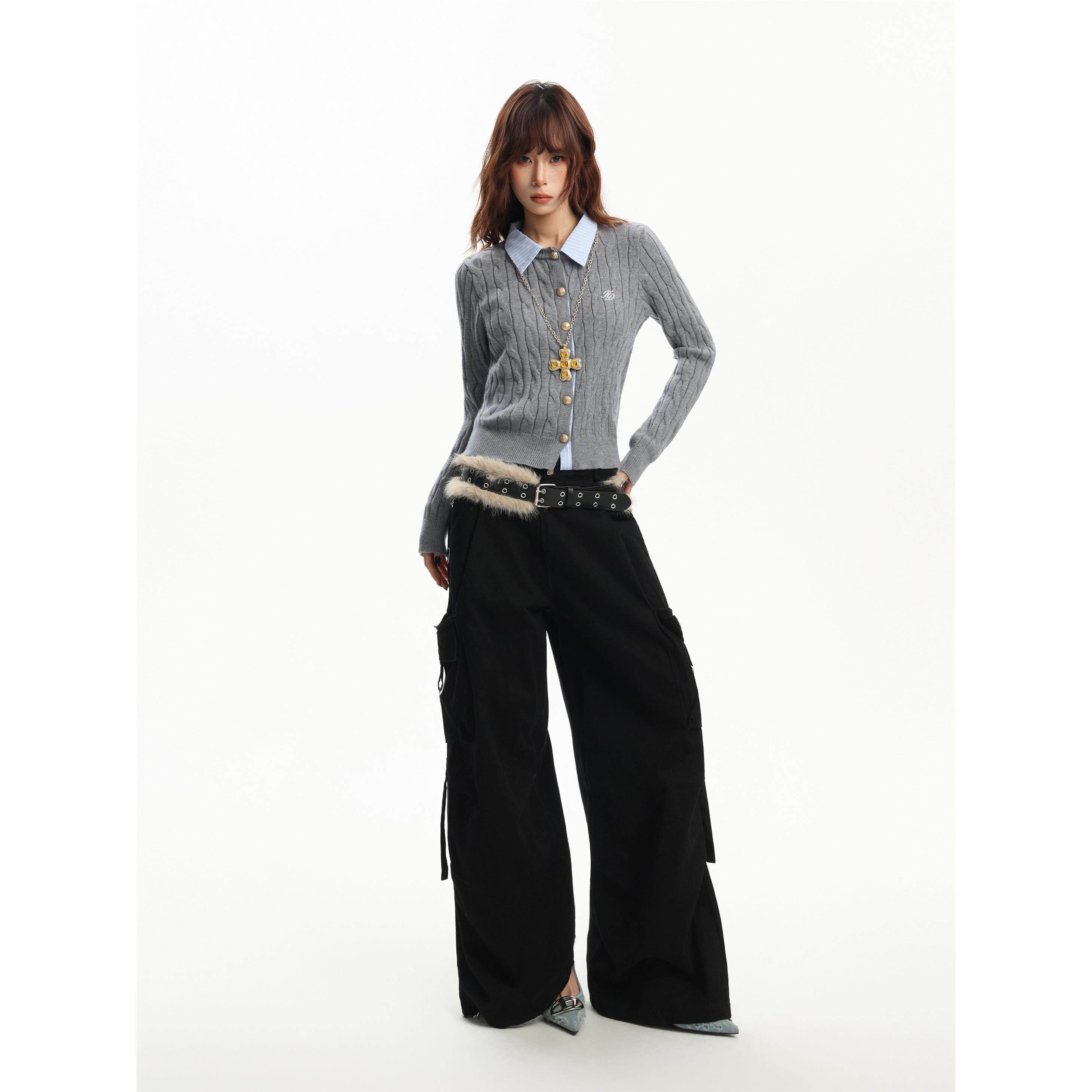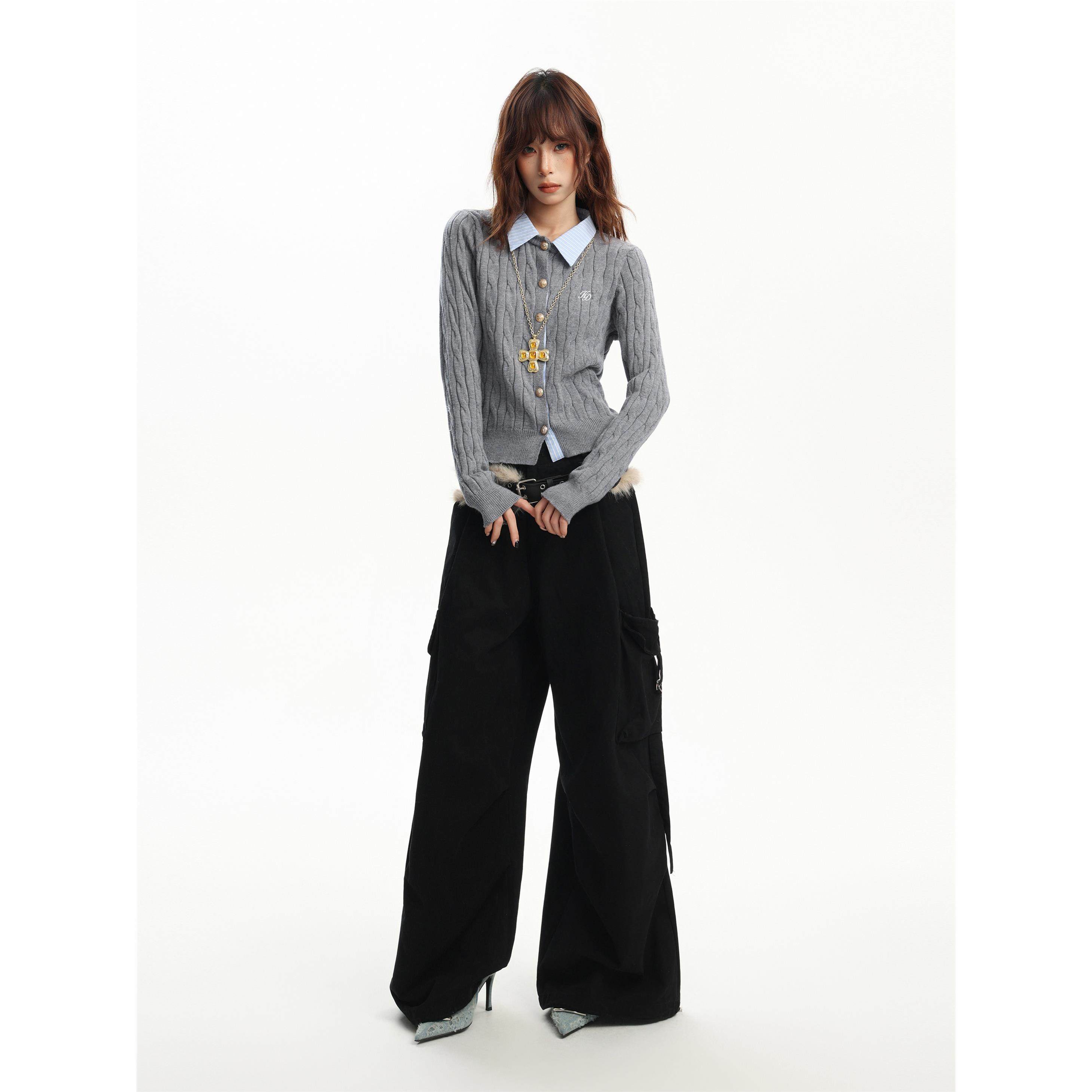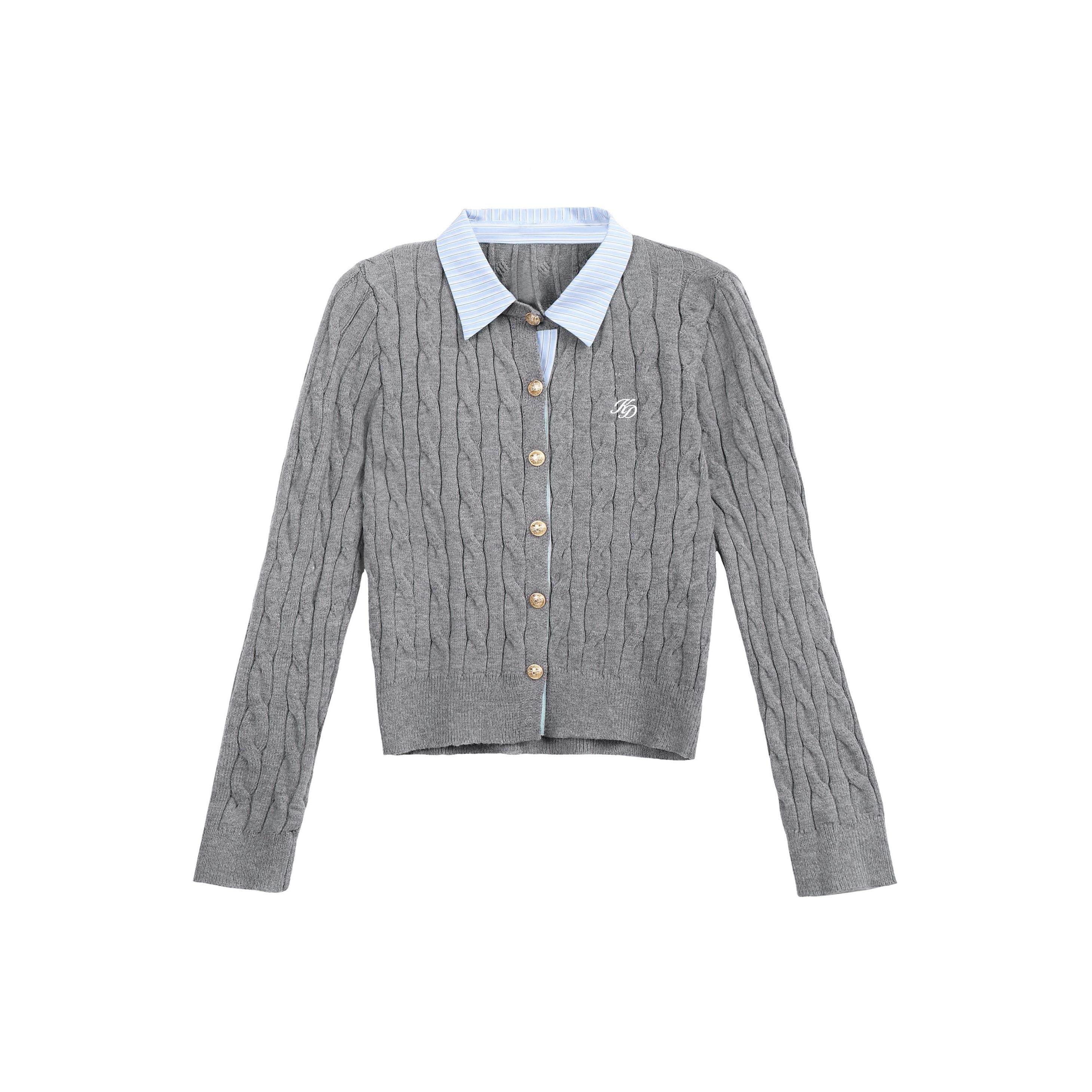 美式灰色麻花polo领假两件长袖针织开衫女秋冬季修身短款毛衣上衣