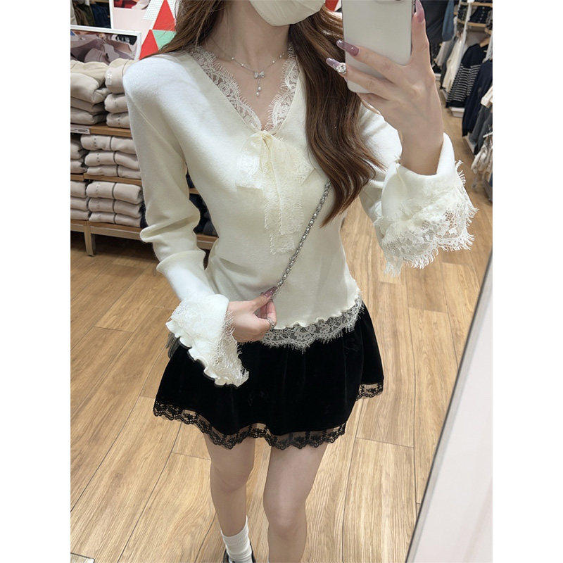 法式V领蕾丝修身打底衫女春季洋派喇叭袖毛衣内搭修身针织衫上衣